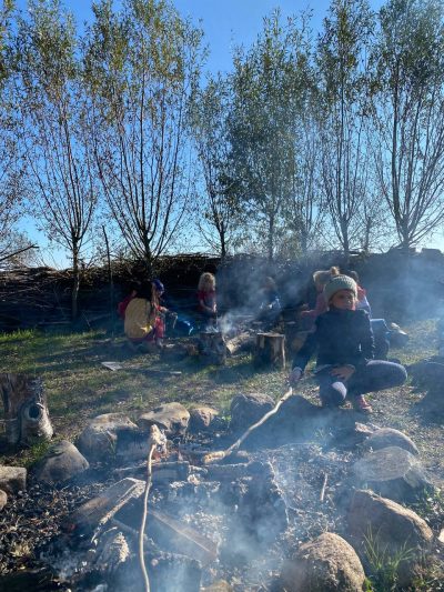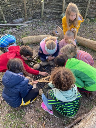 Auf dem Grundstück gab es eine Feuer Challenge. Die Kinder, aufgeteilt in 2 Gruppen, hatten 5 Streichhölzer und sollten damit so schnell es geht ein wärmendes Feuer machen, damit der Gruppenleiter, der bei kaltem Wetter in den Fluss gefallen ist, sich wieder aufwärmen kann.  Sie mussten sich organisieren, absprechen und die Materialien gut einsetzen. Beide Feuer brannten recht schnell und wir konnten später Stockbrot backen.