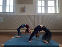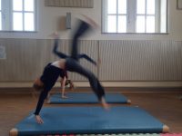 Im Parkourkurs mit Lukas üben die Kinder neue, eindrucksvolle Moves über die Kästen –  und natürlich Akrobatik auf der Airtrack, inzwischen in so komplexen Kombinationen, dass den Lernbegleitern schon beim dokumentieren des Prozesses der Atem stockt.