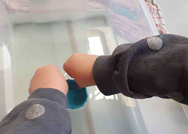 Am Montag haben wir wieder experimentiert. Die Frage war: Schaffst du es, die Knete so zu formen, dass sie nicht untergeht? Und ja, wir haben es geschafft. Es gab sogar ein U-Boot, welches zwar nicht oben schwamm, aber auch nicht auf den Grund fiel. Und Ein Boot haben wir mit Kugeln befüllt, bis es zu schwer wurde und unterging.
