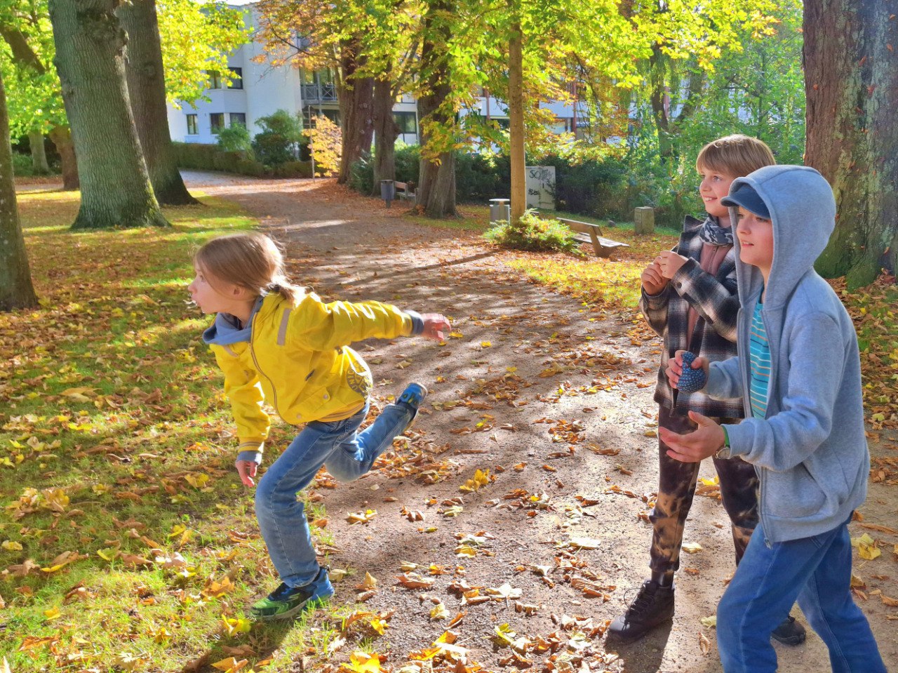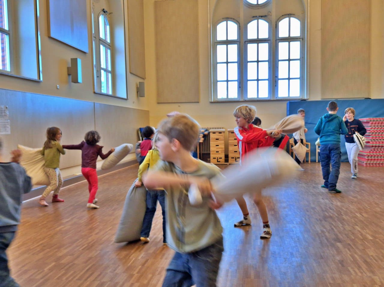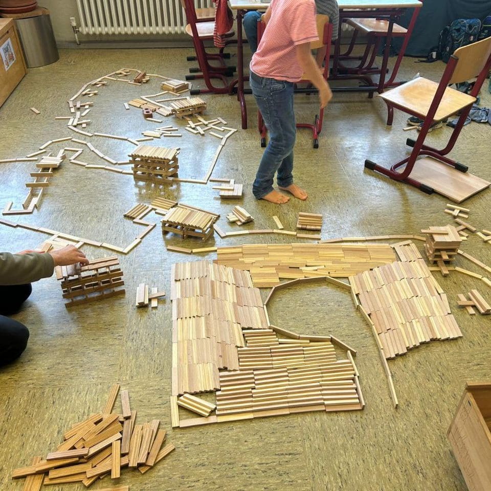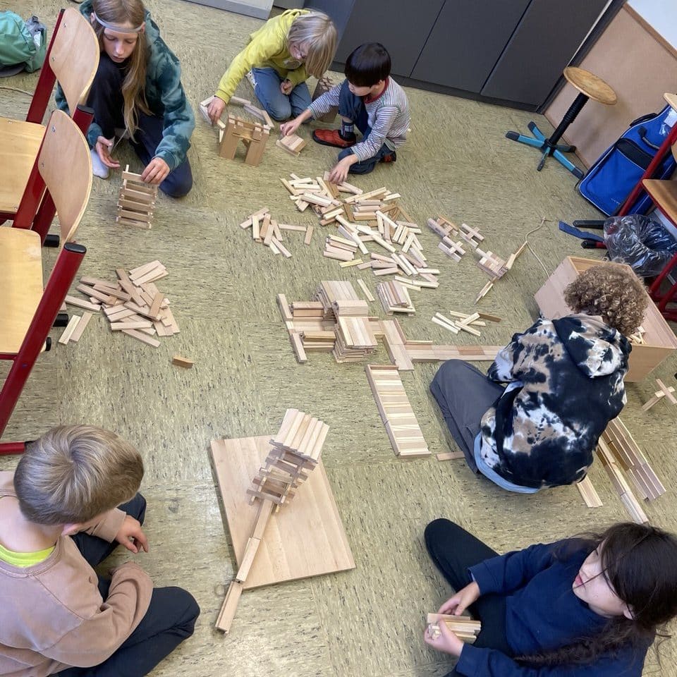 Das ringen-und-raufen Spiel Krabbelkäfer ist seit einigen Wochen „in“ und besonders die älteren Kinder nutzen es im Moment, um sich so richtig auszupowern. Von außen betrachtet wirkt die große Gruppe sehr wild und laut (Freudengeschrei), doch bei genauerem Hinsehen verläuft alles nach den bekannten Regeln, bei denen persönliche Grenzen geachtet werden. Natürlich tut mal jemand ausversehen jemand anderem weh (oder sich selbst). Dann verlassen die Betroffenen für eine Weile die Arena und kehren zurück, sobald sie sich wieder bereit fühlen. Interessanterweise muss der begleitende Lernbegleiter weder wegen unfairem Verhalten- noch wegen Wutanfällen „weil einer einem anderen extra weh getan hat“ eingreifen. Es ist schön zu sehen, wie sehr sie zusammengewachsen sind, so dass ihnen klar ist, dass Verletzungen ein Versehen sind und keine persönliche, negative Absicht dahinter steckt.