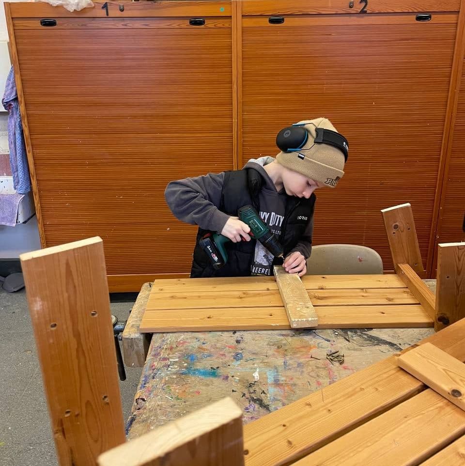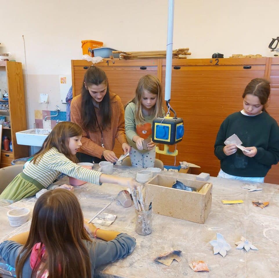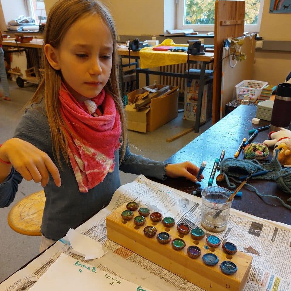 Hier seht ihr: Geschäftiges Werken. Ein Kind baut eine Bank für sich und seinen Freund; das Holz dazu hat Nils vom Sperrmüll geholt. Töpfern mit Emma, Nähen (nicht auf dem Foto) und Malen in der Zauberwerkstatt. Jule hat für ihr Kuscheltier einen funktionstüchtigen Minirucksack mit Extra-Innen- und Außenfach und Reißverschluss genäht: “Ich habe schon mal einen richtigen Rucksack für meinen Bruder genäht und jetzt habe ich mir einfach den Schnitt davon abgeguckt.”