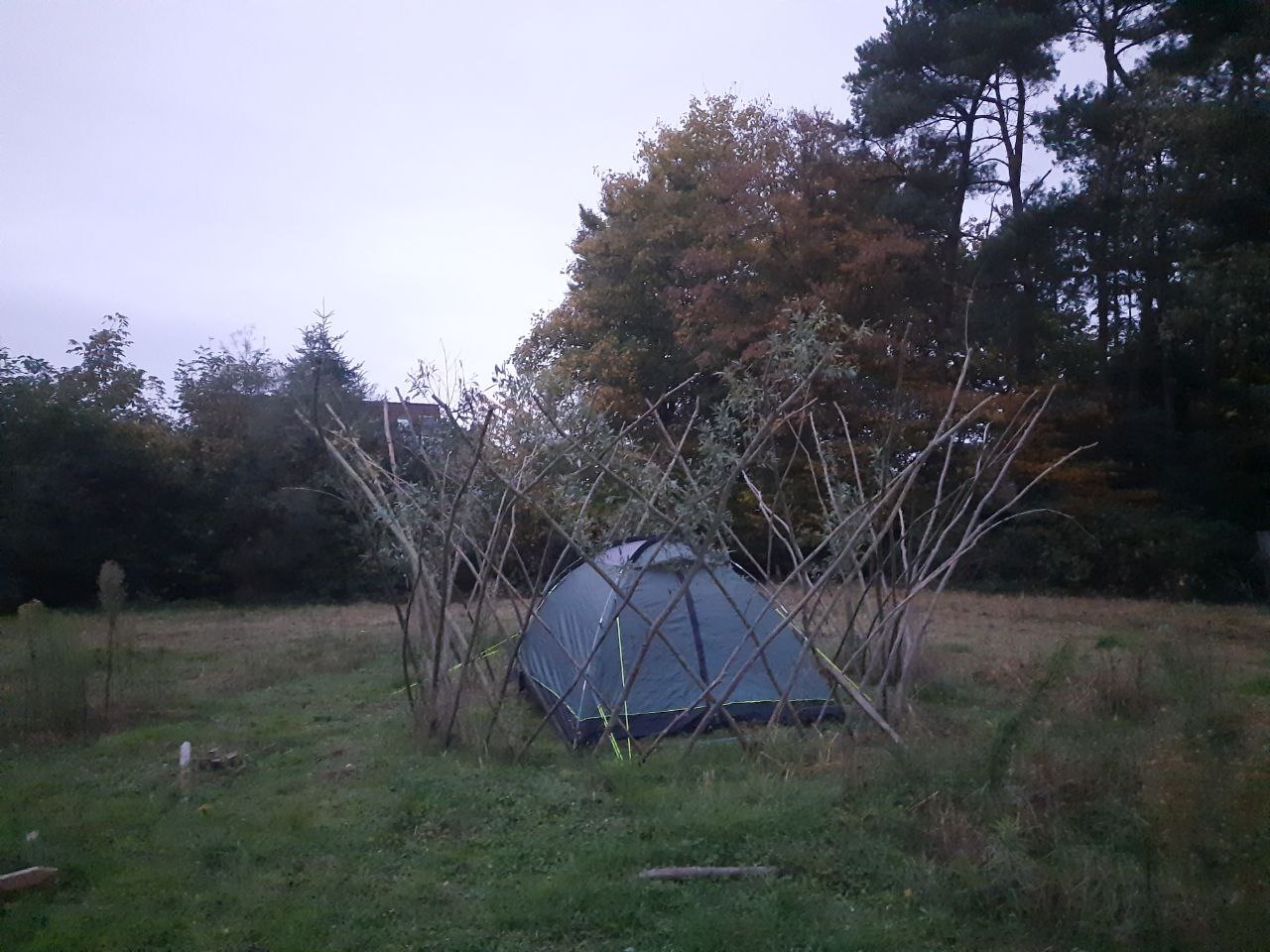 Nachdem die meisten angekommen waren, haben wir eine Minibesprechung am Feuer gemacht und festgelegt, dass wir zwei Zeltbereiche brauchen: einen für die, die früher schlafen gehen wollen, und einen für die, die lange wach bleiben wollen. Das hatten wir aus der letzten Übernachtung gelernt: wohlfühlen bedeutet für die einen: in Ruhe schlafen können wenn man müde ist- und für die anderen: lange aufbleiben und spät noch mit den Freunden auf unserm Grundstück herumstreifen, quatschen und lachen. Uns war wichtig, beides zu ermöglichen und es hat auf diese Art gut geklappt.