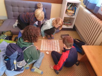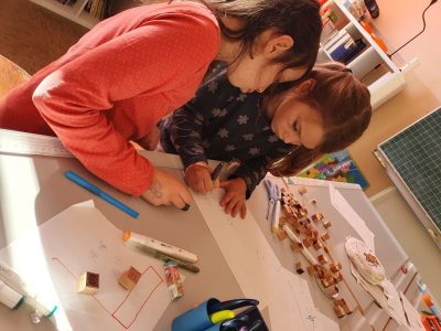 In Annas Gruppenzeit erstellen die Kinder ein „Lapbook“ zu einem selbstgewählten Thema. Einige wussten sofort ihr Thema, andere brauchten ein bisschen Zeit und die guten Ideen der Gruppe. Jetzt wird erstmal das Deckblatt gestaltet und überlegt, auf welche Weise welche Inhalte im Lapbook präsentiert werden sollen. Dann kommt die Schreib- und Gestaltungsarbeit.
