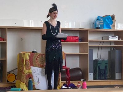 Unser Siegertreppchen. Manch einer hatte gar nicht mit einer Platzierung gerechnet und musste erst mal im Gebäude gesucht werden. Und die Ansagerin – von vor 100 Jahren.