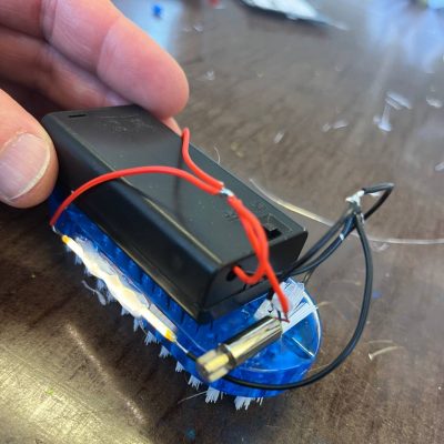 Wir haben Bürsten-Roboter gebaut. Dafür hatten wir Vibrations-Motoren, wie sie auch in Handys sind, Fingernagel-Bürsten und Batterien. Die Motoren haben wir auf die Bürsten geklebt und dann vibrierten sich die Mini-Roboter vorwärts – oder aber im Kreis oder alles durcheinander. Manche Kinder haben Holzteile, eine Beleuchtung- oder Stoßstangen angebracht. Manche Roboter wurden mit mehreren Motoren ausgestattet. Wir wollen das nächste Mal weiterbauen, vielleicht mit einem Parcour oder einer Wettkampfarena.