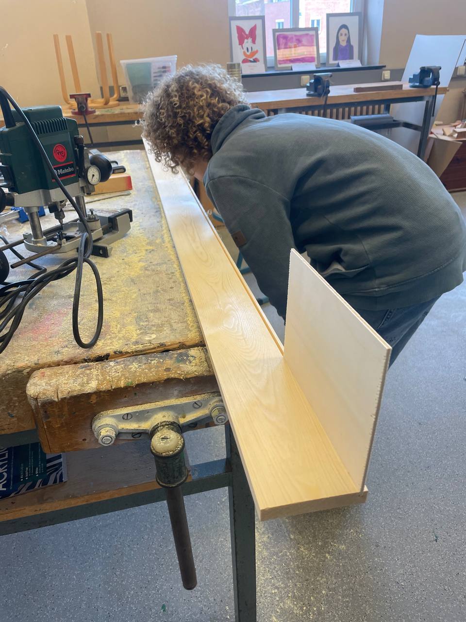 Mit der Fräse erstellen wir eine Nut, in die wir anschließend den Boden einlegen können. In einem Fall verbinden wir die Seitenwände mit Schrauben, in einem anderen Fall erstellen wir eine aufwändige Leimverbindung. Es ist erstmal schwer mitanzusehen, wenn jemand anders schneller fertig ist. Am Ende überwog aber die Freude über die schöne, schraubenlose Verbindung.