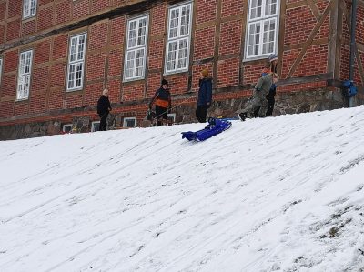 Rodeln am Naturtag: Einige Kinder hatten Lust auf Rodeln und so sind wir noch mal zu unserem Rodelberg gelaufen. Der Weg klappt, die Kinder halten sich an die Regeln, passen auf, die größeren Jungs haben von selbst auf uns gewartet, als sie gemerkt haben, dass die Jüngeren langsamer gehen. Wir erklären, warum bestimmte Dinge nicht erlaubt sind, wie den gefrorenen See zu betreten. Die Grenzen werden erfragt – und nicht überschritten.