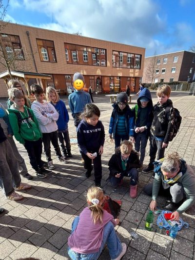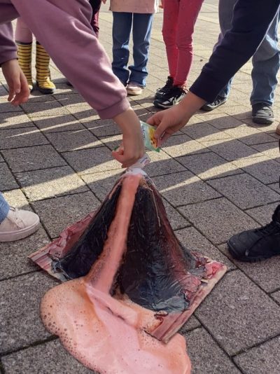 Was das eigentlich ist, haben wir vorher noch anhand eines Bilder-Textpuzzles gelernt. Vulkane brechen nämlich auf ganz verschiedene Arten aus: Manchmal ist die Lava flüssig, manchmal zäh und voller Kristalle. Dementsprechend brechen manche Vulkane sehr explosiv aus, dabei werden sogenannte Bomben herausgeschleudert. (Das hätten die meisten natürlich am liebsten gesehen bei unserem Modell). Andere produzieren kleinere Lavafontänen, manchmal kommen vor allem Gas- und Aschewolken aus dem Schlot und manchmal fließt die Lava aus dem Krater und breitet sich fast schon gemächlich aus – so wie bei unserem hawaiianischen Modell. Glücklicherweise konnten sich alle bei dieser sogenannten effusiven Eruption noch rechtzeitig in Sicherheit bringen.