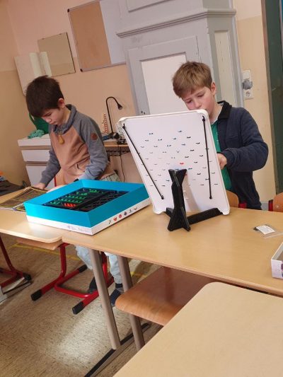 Jonas baute heute mit Hilfe des Turing Tumbles eine Zählmaschine mit der er im Binärsystem erst die Kugeln vorwärts und danach rückwärts zählen kann. Dafür benutze er sogenannte Bits (Schalter) die entweder den Zustand 0 oder 1 einnehmen können.