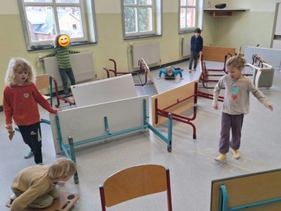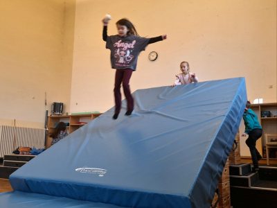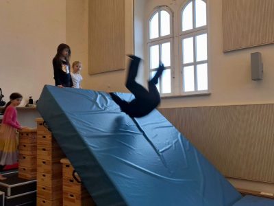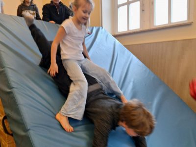 Unser Wochenausklang zu Beginn: Freude bei Manuels Bewegungsparkour in der Aula.