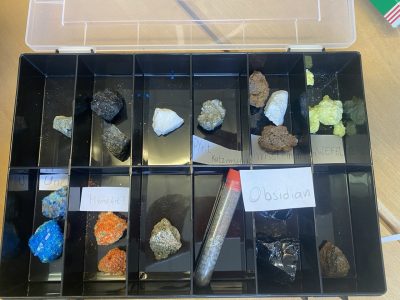 Wir bestimmen Steine und Mineralien vulkanischen Ursprungs mit Hilfe von Büchern und dürfen feststellen: Schwefel stinkt tatsächlich ziemlich unangenehm!