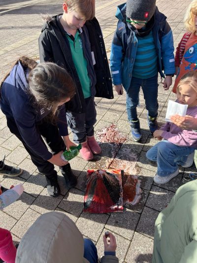 Heute war es endlich soweit: Der Vulkan konnte ausbrechen. Nachdem er von verschiedenen Kindern mit viel Hingabe gebaut, bemalt und mit Sprühlack und Knete wasserdicht gemacht wurde, wurde Natron in die Essig-Spüli-Lebensmittelfarbe-Mischung gegeben. Seht Selbst: Eine wunderbare hawaiianische Eruption.