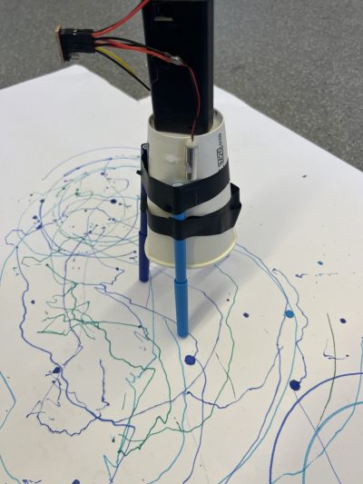 Filzstifte an einen Pappbecher zu montieren und wieder die Motoren anbringen, so dass der Becher auf den Stiften stehend Muster auf ein Papier malt. Es kamen immer wieder andere Kinder dazu, die auch gern einen Roboter hätten – manche wollen allerdings lieber nicht mitbauen, sondern einfach einen fertigen mit nach Hause nehmen.