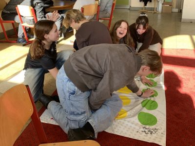 Das „Spiel der Woche“ ist Twister. Junge Menschen, die zum Teil ziemlich verknotet auf der Matte liegen, hocken, knien…hier ist Beweglichkeit angesagt. Und der Spaß ist groß!
