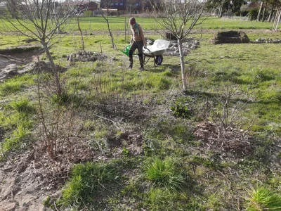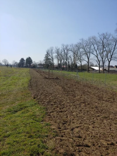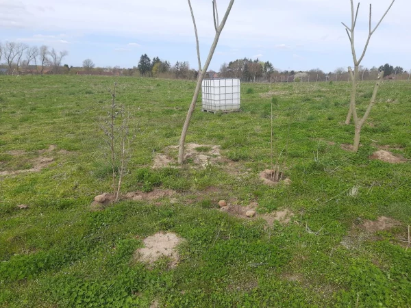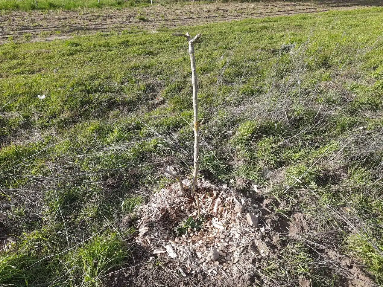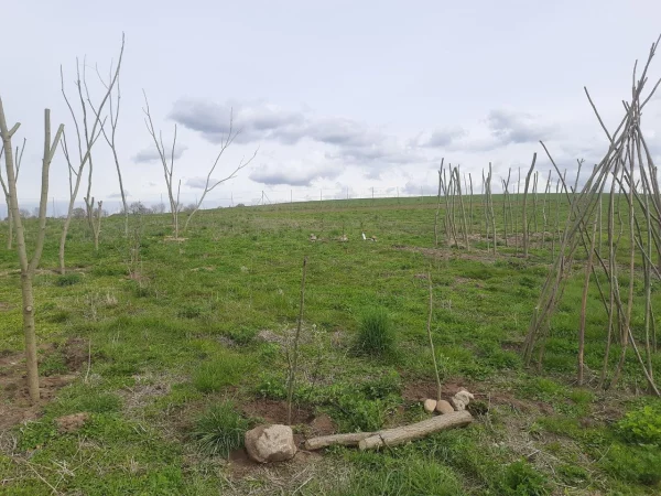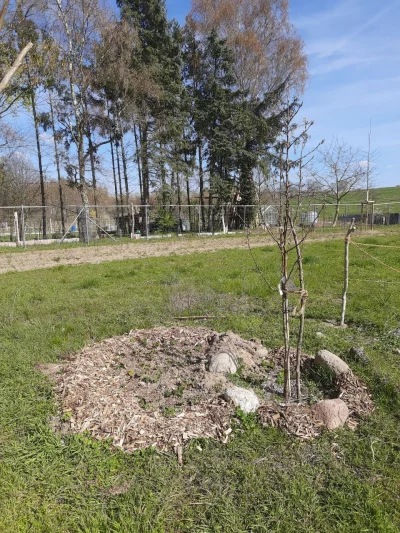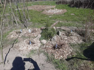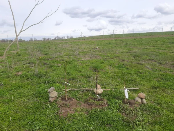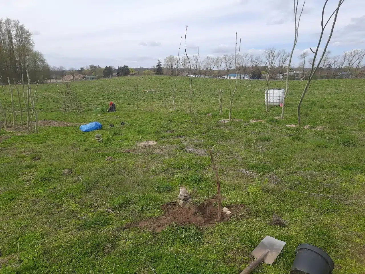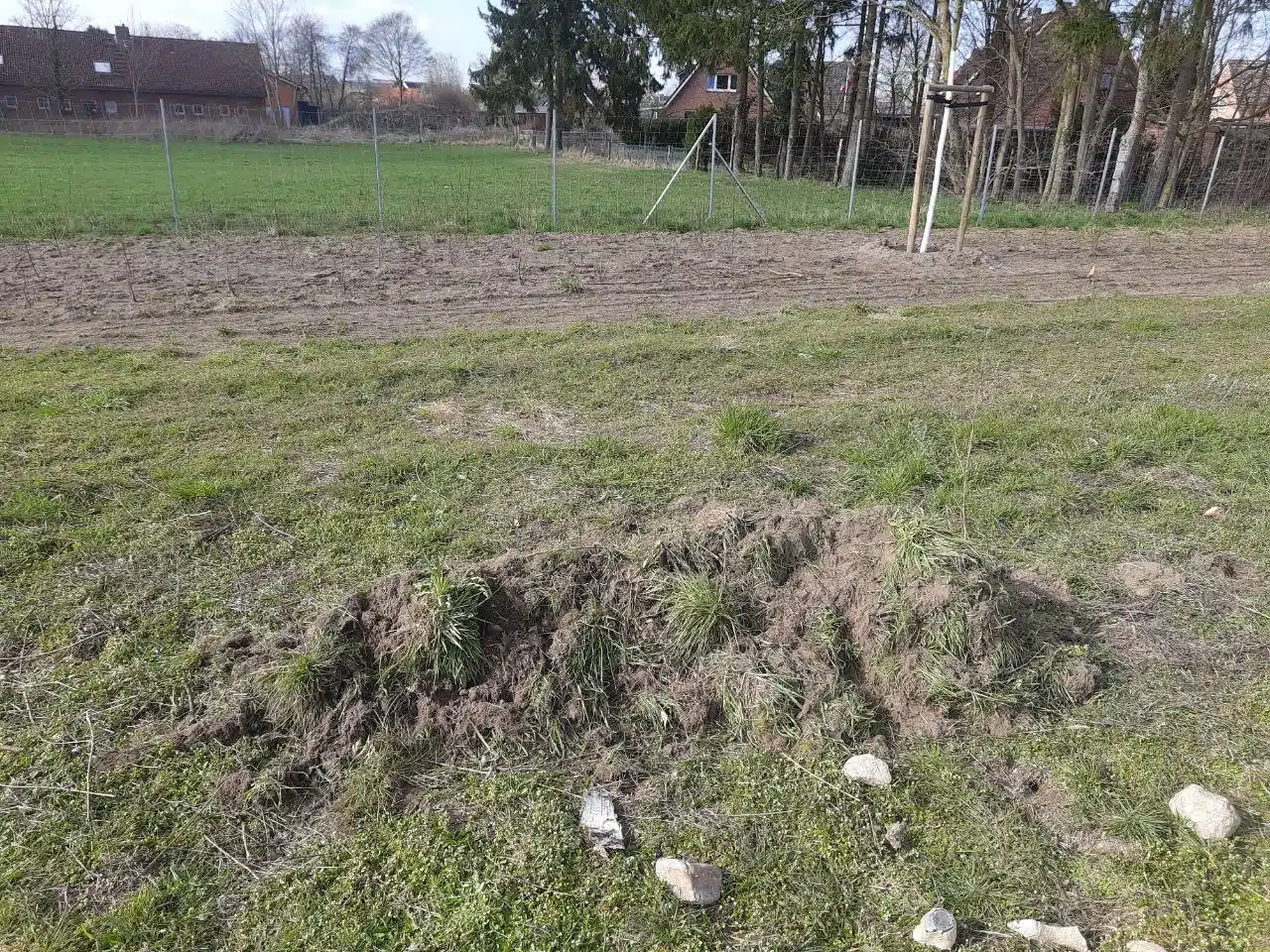 Die dicken Hölzer und Steinhaufen liegen dort zur Kennzeichnung der kleinen Sträucher, da wir erwarten, dass die Wiese demnächst hoch wächst.