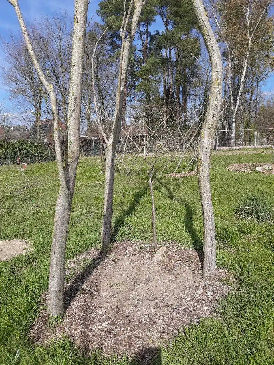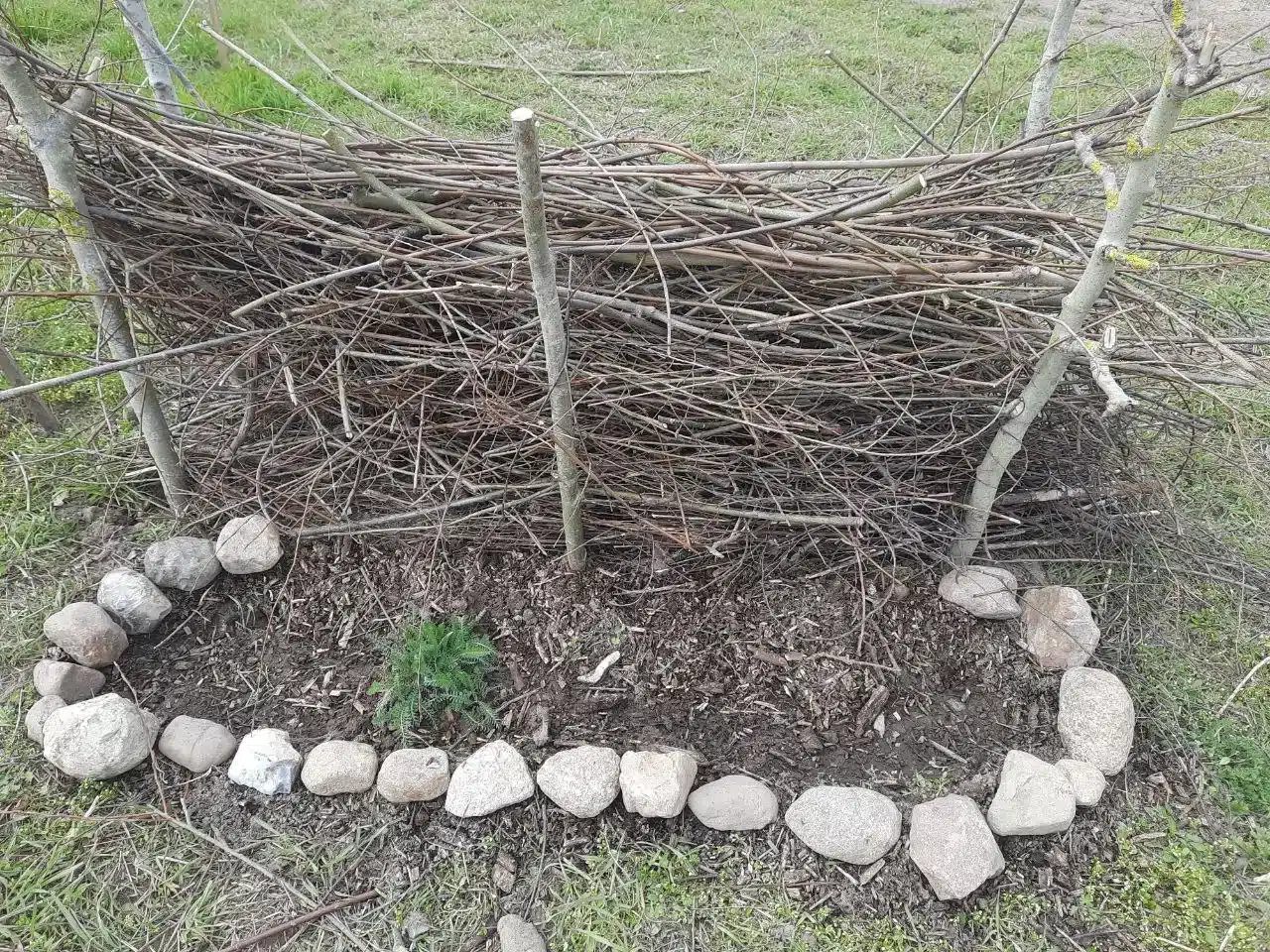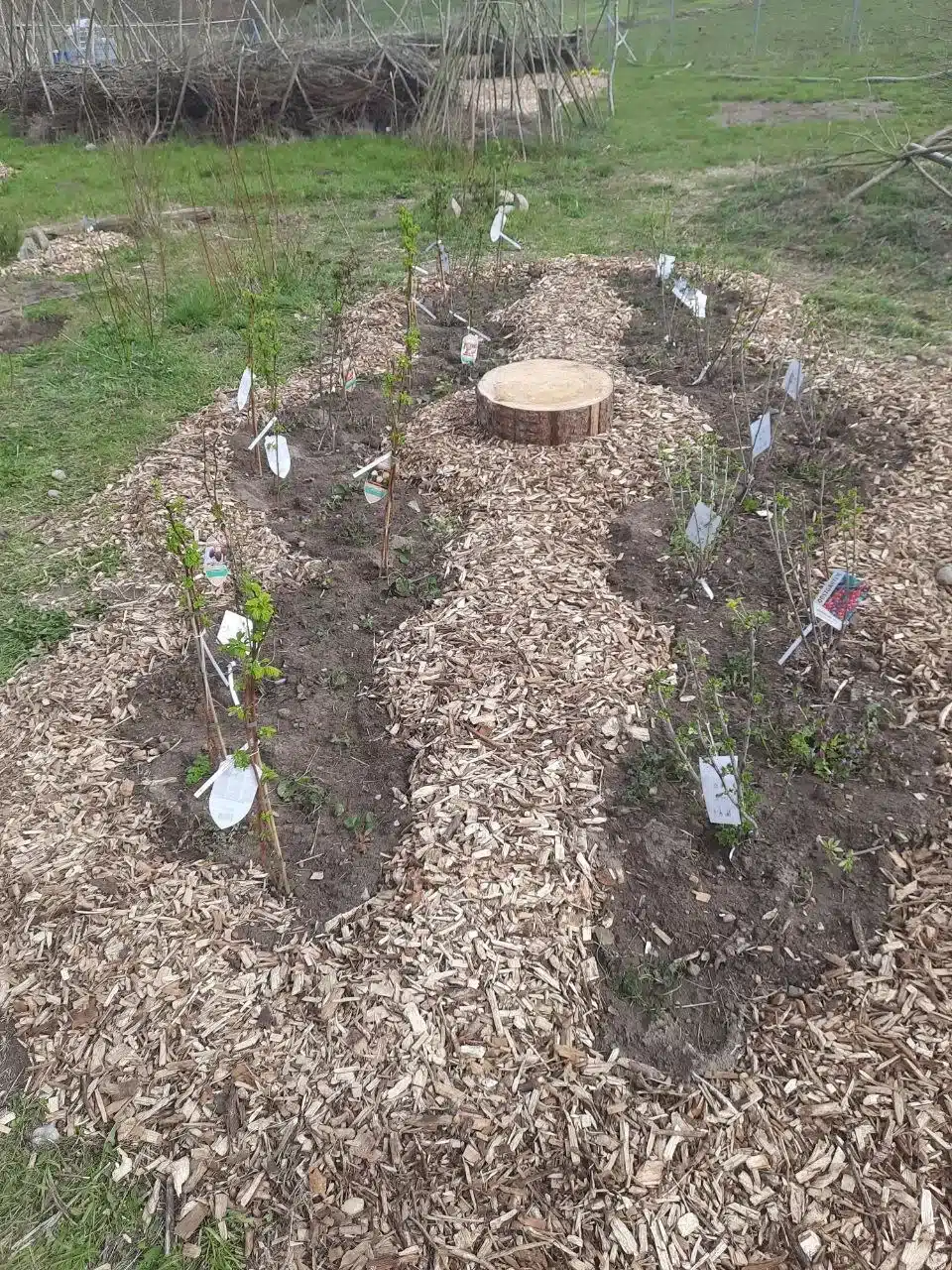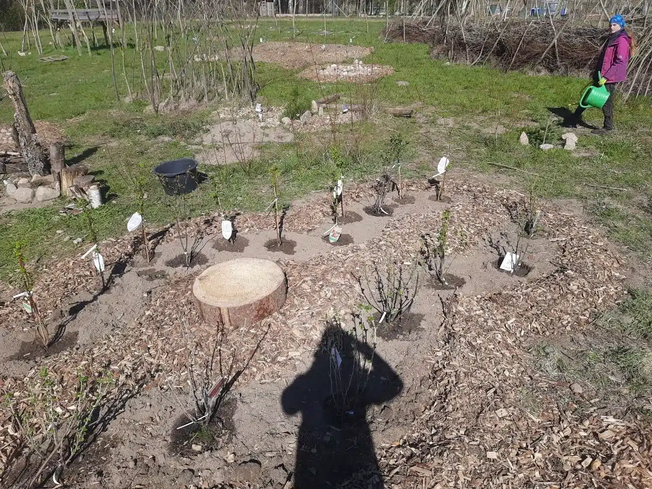 Auch bei unserem zukünftigen Kindergartenplatz tut sich was: Wir haben eine kleine Reihe Himbeeren, zwei Felsenbirnen, Schmetterlingsbäume und einen Bienenbaum gepflanzt. Dadurch ergibt sich zwischen dem “Weidenwäldchen”, dem kleinen Tipi und dem halbrunden Windschutz ein gemütlicher, runder Platz.