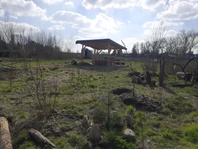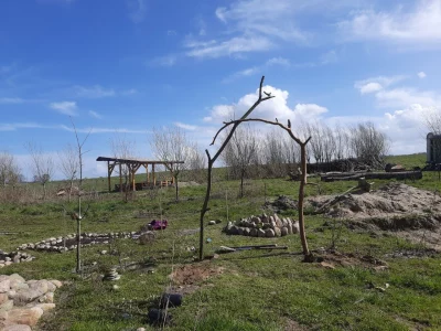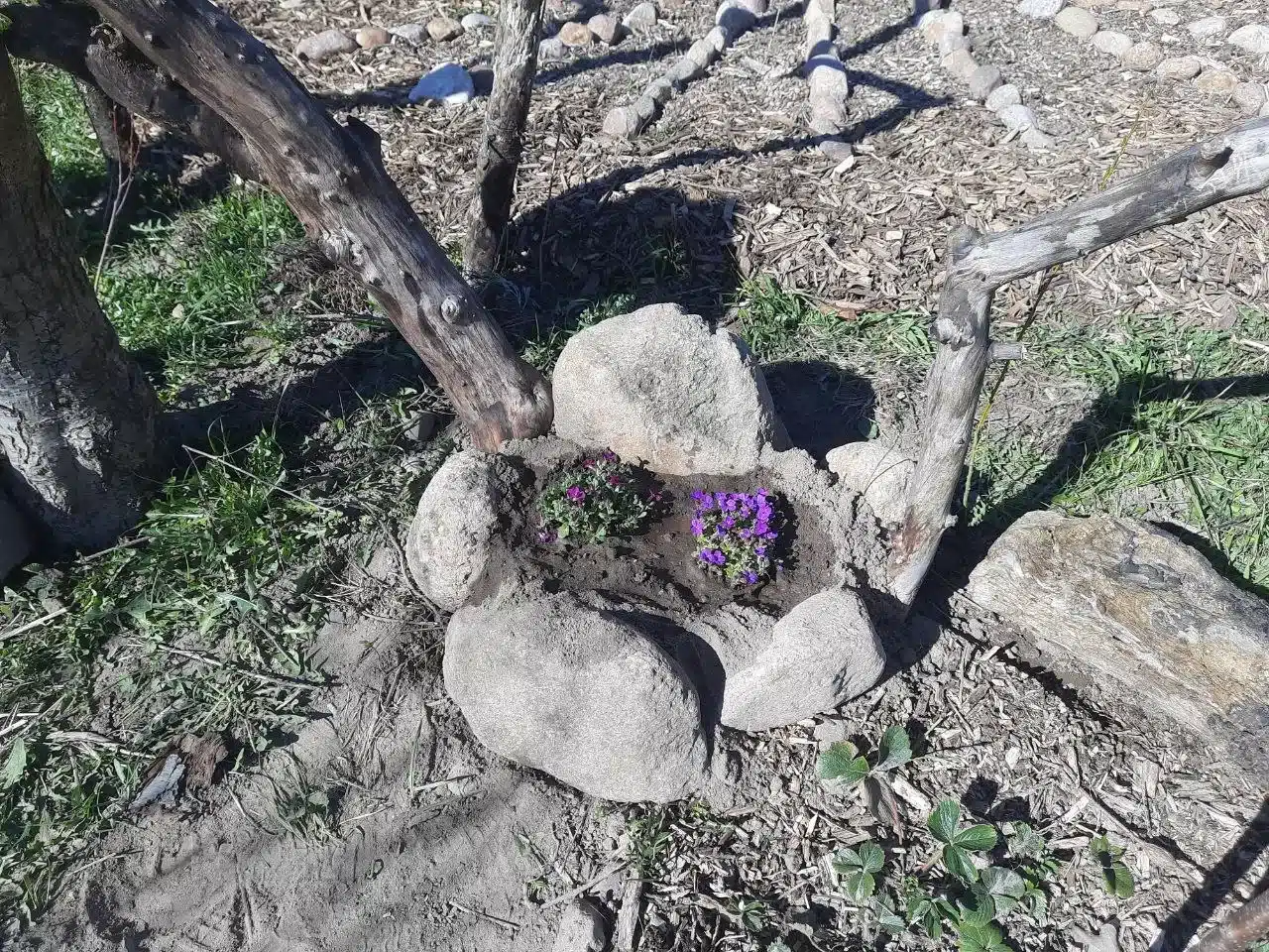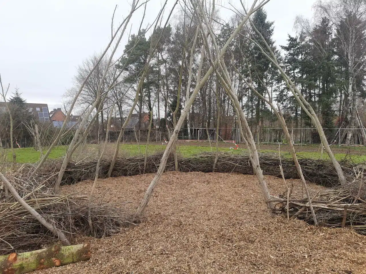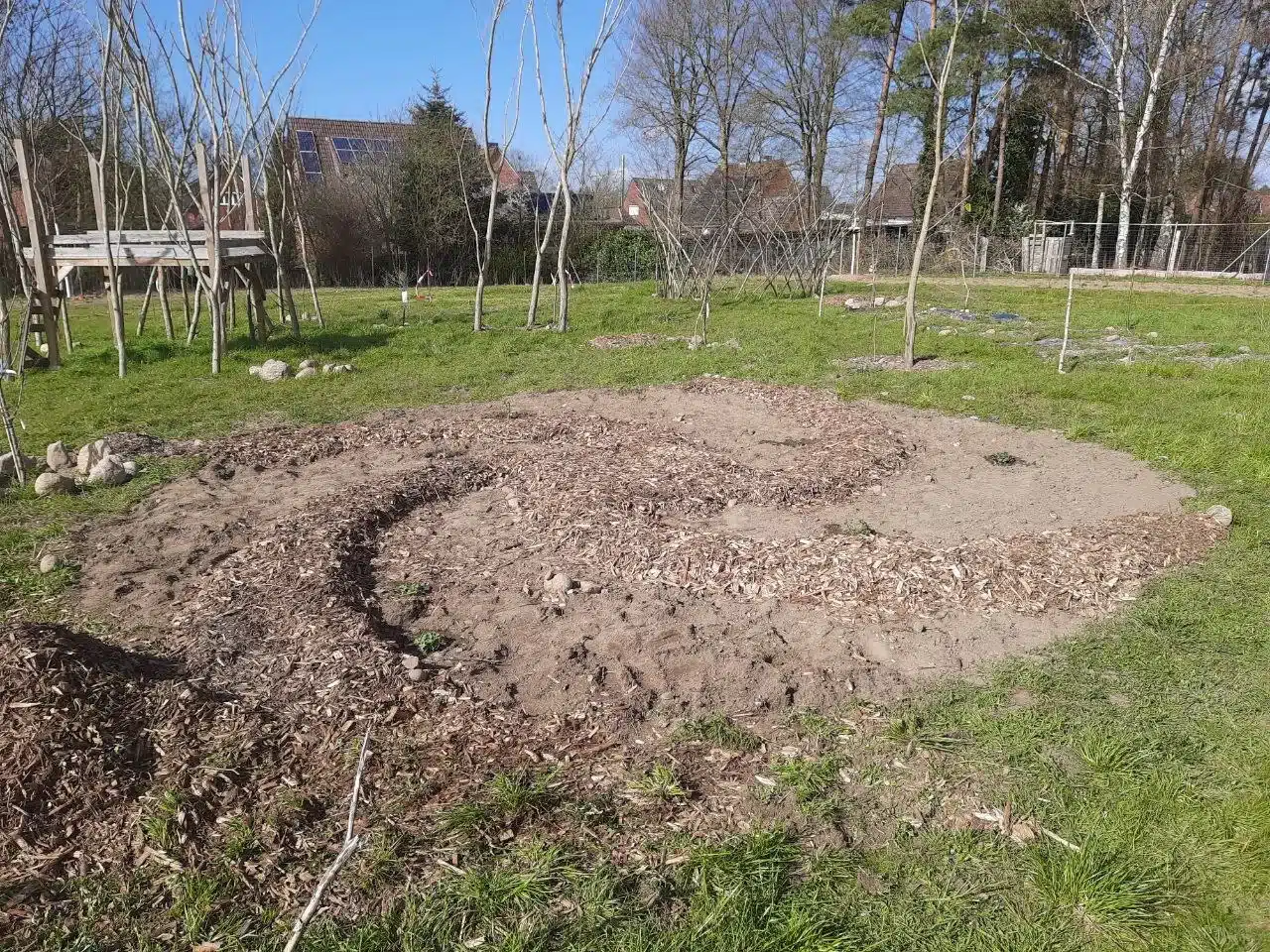 Auch bei unserem zukünftigen Kindergartenplatz tut sich was: Wir haben eine kleine Reihe Himbeeren, zwei Felsenbirnen, Schmetterlingsbäume und einen Bienenbaum gepflanzt. Dadurch ergibt sich zwischen dem “Weidenwäldchen”, dem kleinen Tipi und dem halbrunden Windschutz ein gemütlicher, runder Platz.