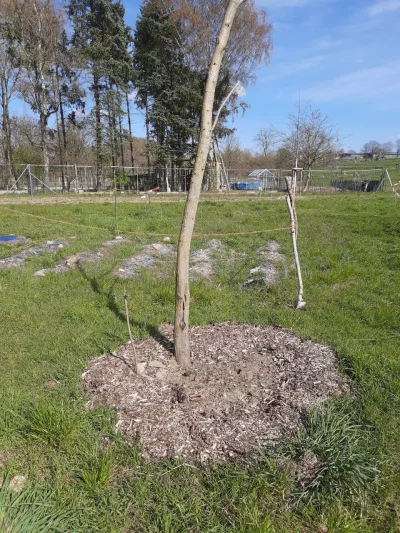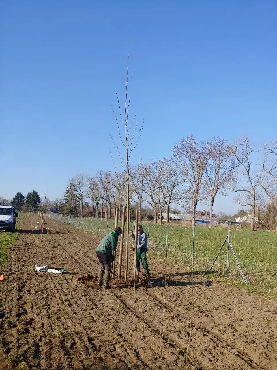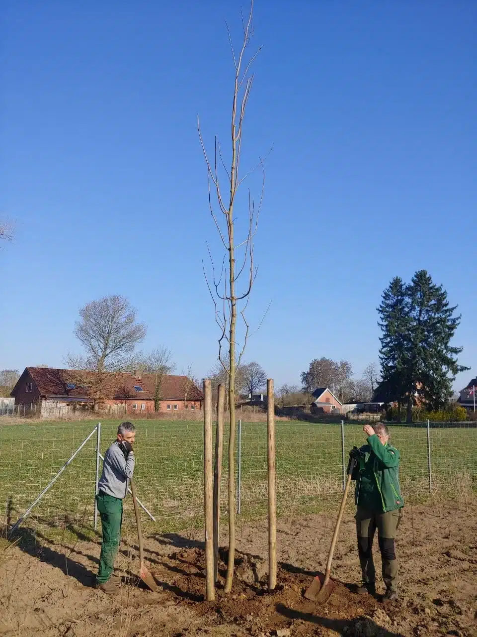 Die Gärtner haben uns einige 6m hohe Bäume (Linde, Ahorn, Eiche…) eingepflanzt und mit weißer Schutzfarbe bestrichen.