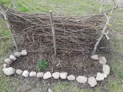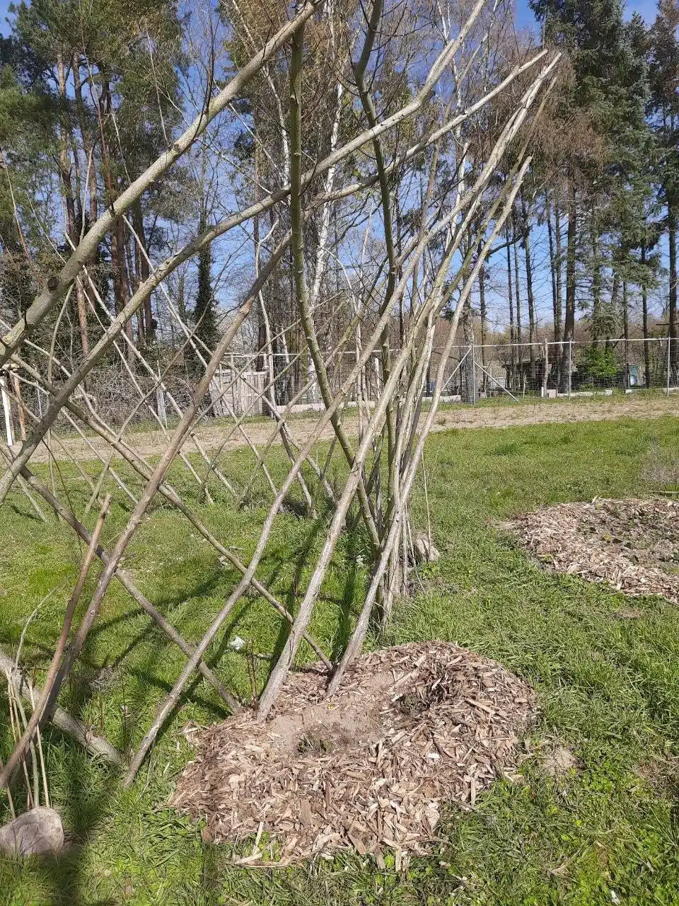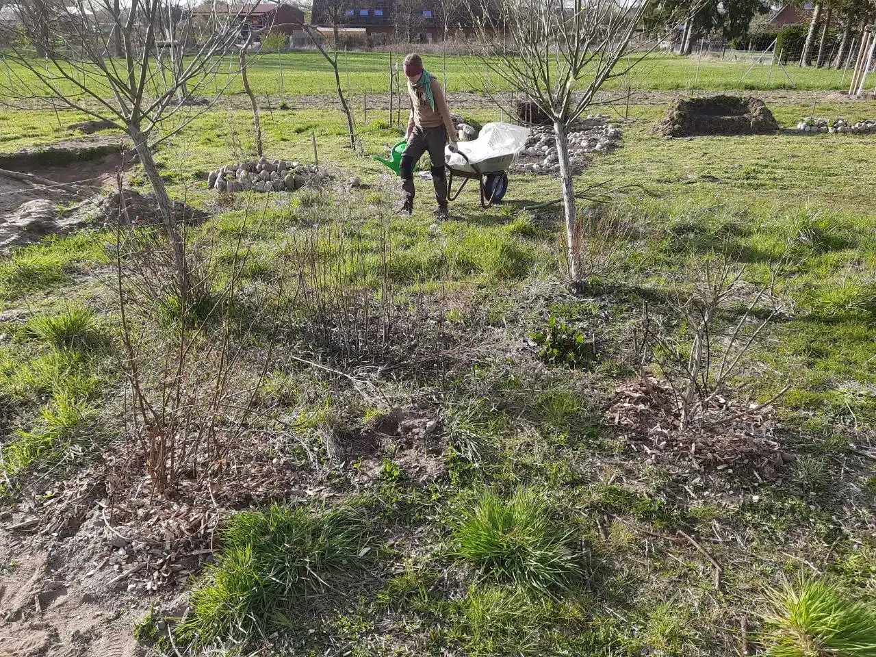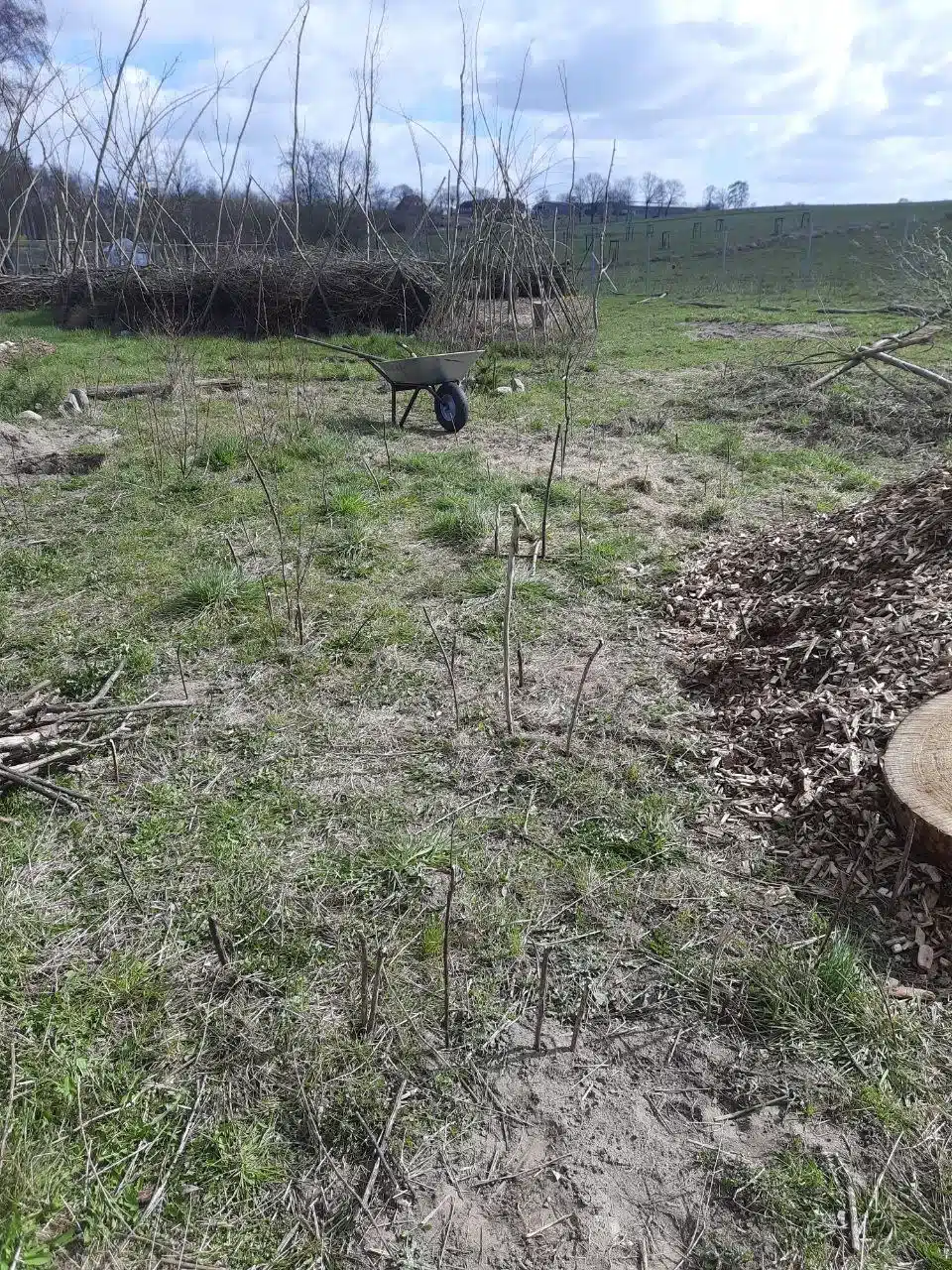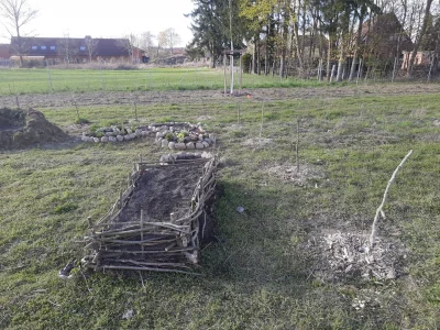 Jan hatte uns drei Anhänger voller Pappelzweige geschenkt, die sind inzwischen in der neuen Benjeshecke verschwunden, genauso wie der Rest der Weiden vom Herbst. Die meisten Weiden hatten wir beim zukünftigen Kindergartengebiet verbaut. Die übrigen Stammteile dienen zur Zeit als Abgrenzung zur Hecke (damit man die kleinen Pflänzchen sieht), die mittleren Stöcker sind zu Stockbrotstöckern umfunktioniert und die Zweige dienen als Windschutz in der Benjeshecke.