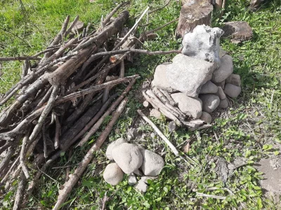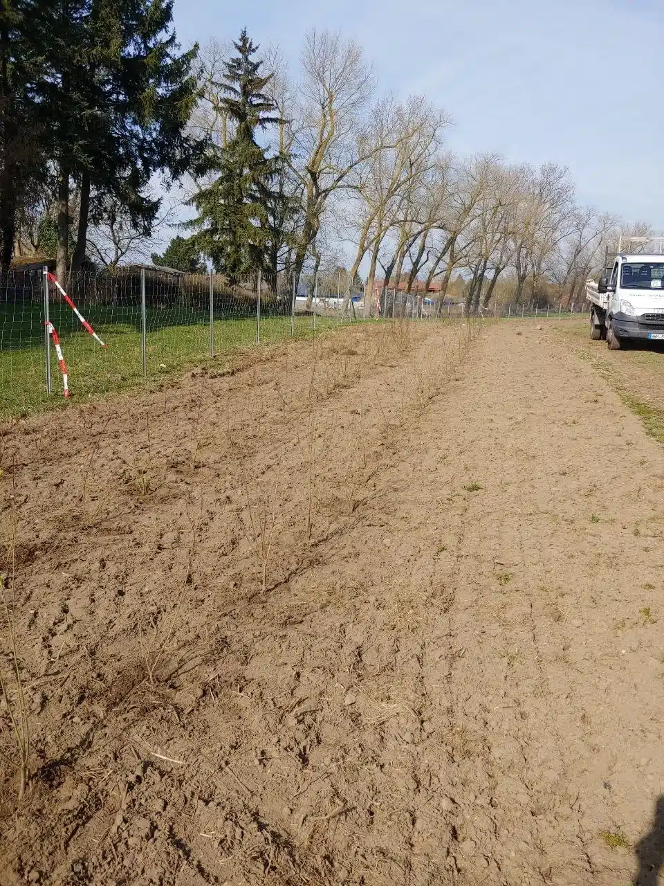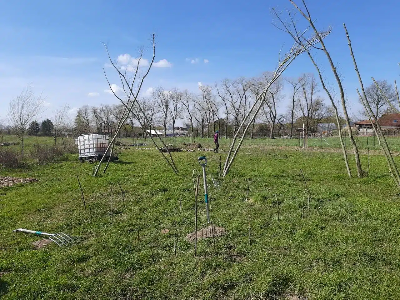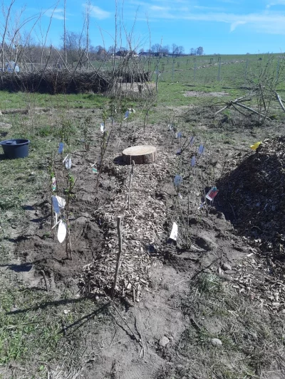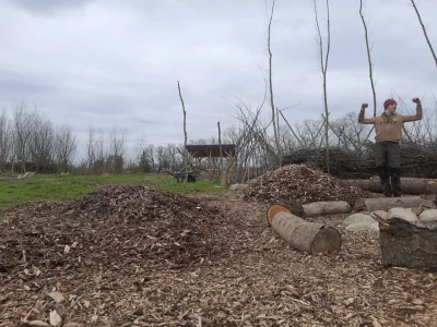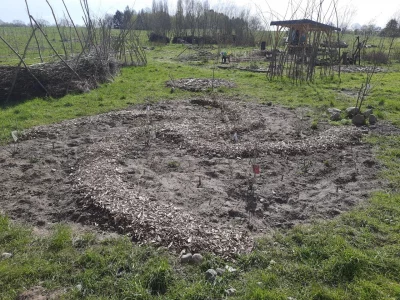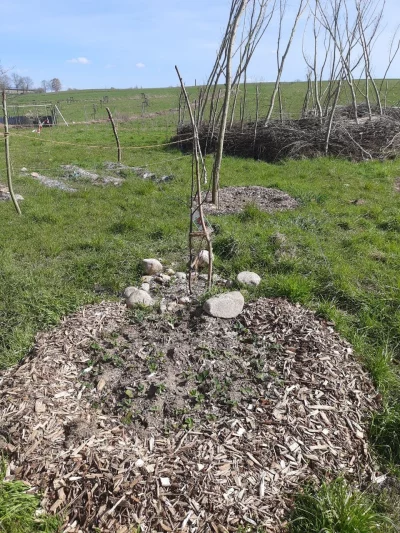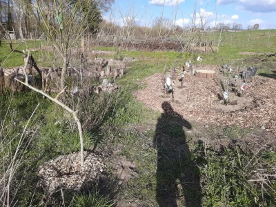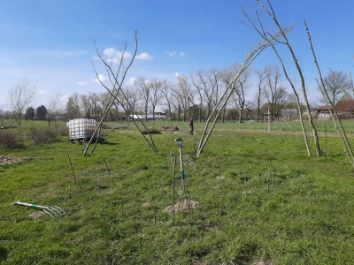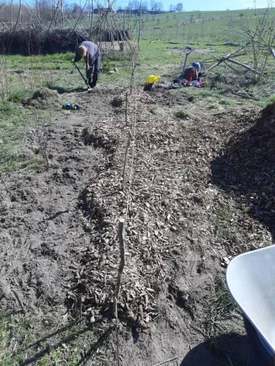 Jan hatte uns drei Anhänger voller Pappelzweige geschenkt, die sind inzwischen in der neuen Benjeshecke verschwunden, genauso wie der Rest der Weiden vom Herbst. Die meisten Weiden hatten wir beim zukünftigen Kindergartengebiet verbaut. Die übrigen Stammteile dienen zur Zeit als Abgrenzung zur Hecke (damit man die kleinen Pflänzchen sieht), die mittleren Stöcker sind zu Stockbrotstöckern umfunktioniert und die Zweige dienen als Windschutz in der Benjeshecke.