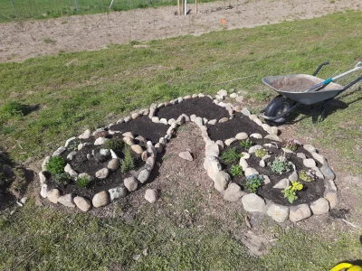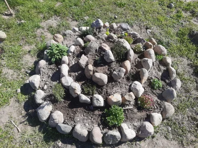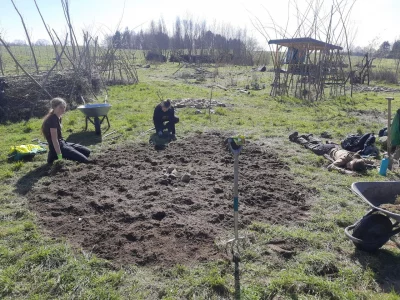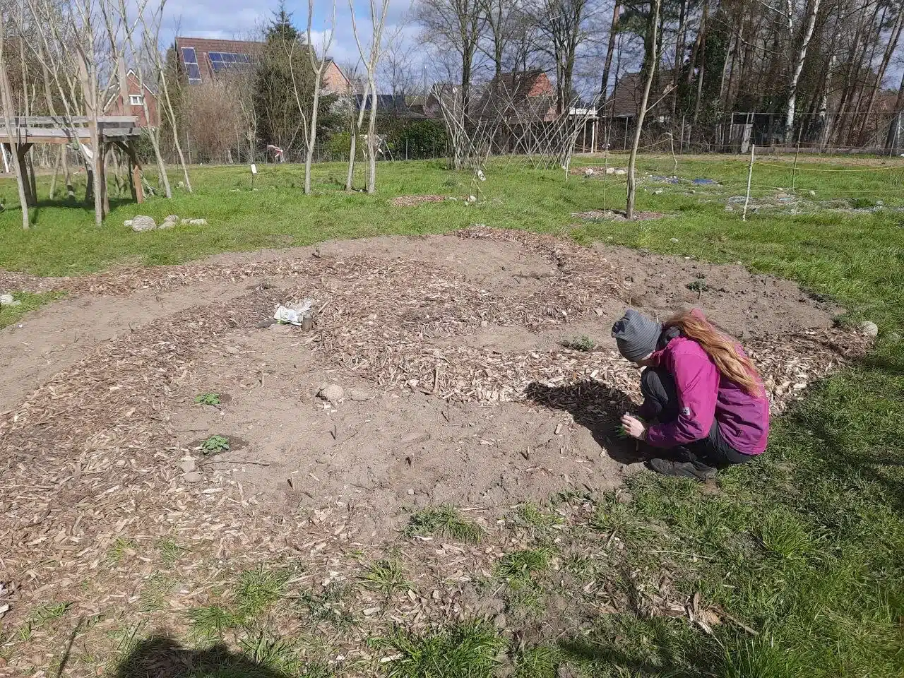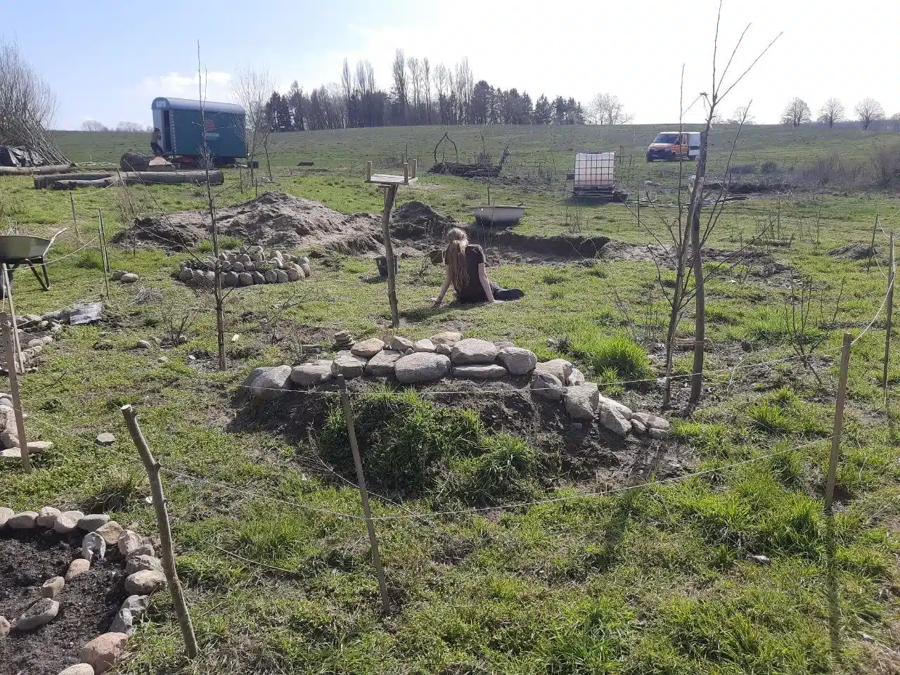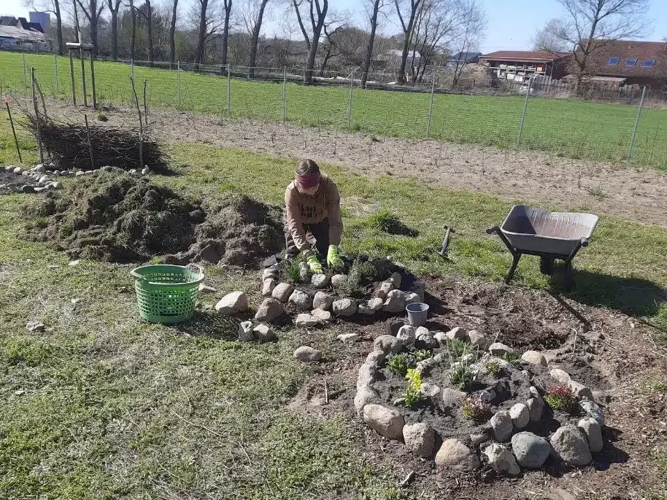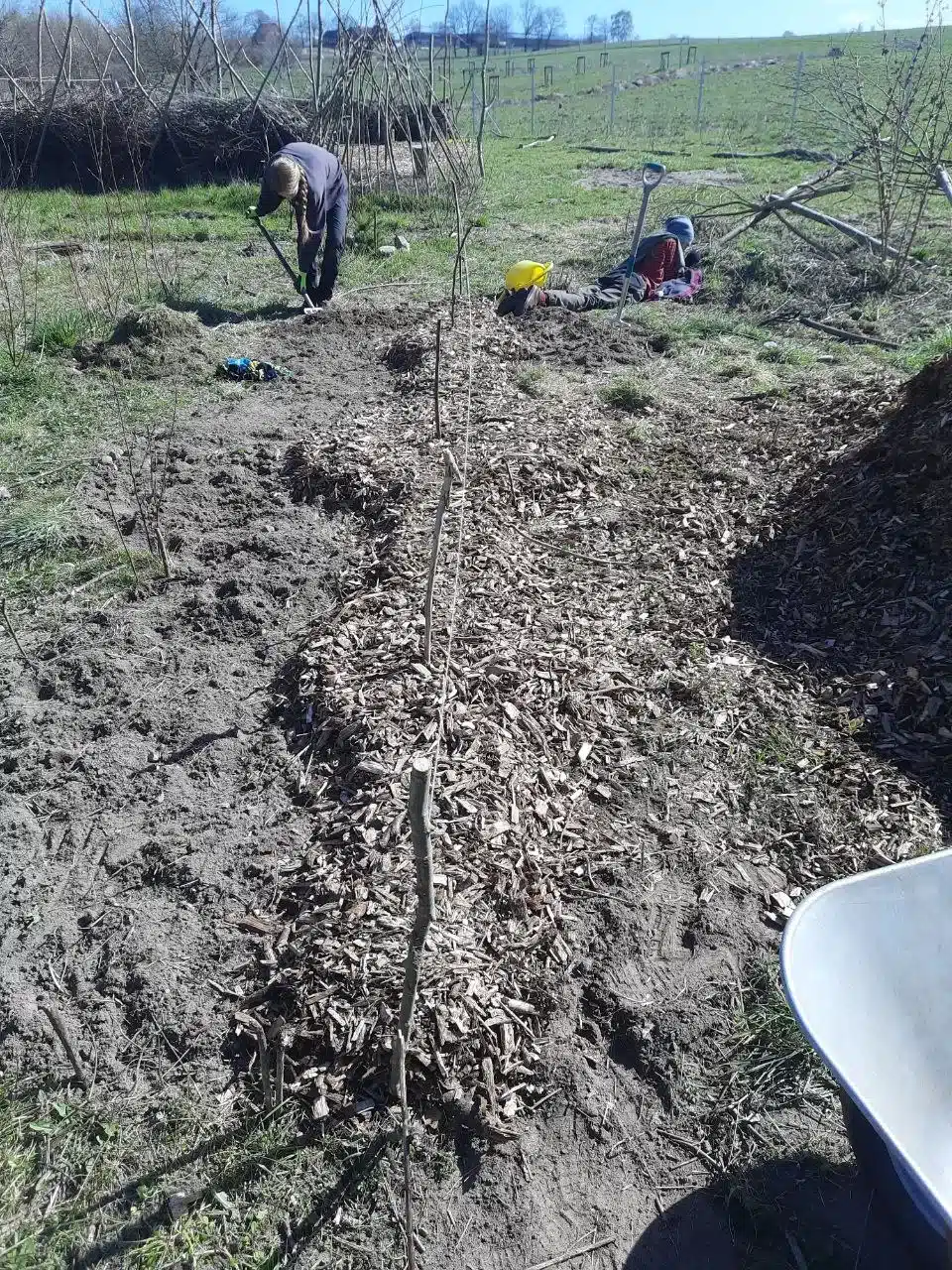 Malin und Elina legen Beete und verschiedene Elemente an: Kräuterspiralen, Bienenblumenbeete, eine kleine Schutzhecke aus Bienenfreundlichen Sträuchern, ein (in Zukunft) bewachsenes Tor, ein Sofa aus den Grassoden, die wir überall „über“ haben.