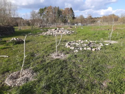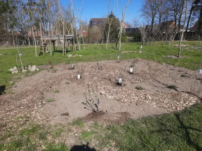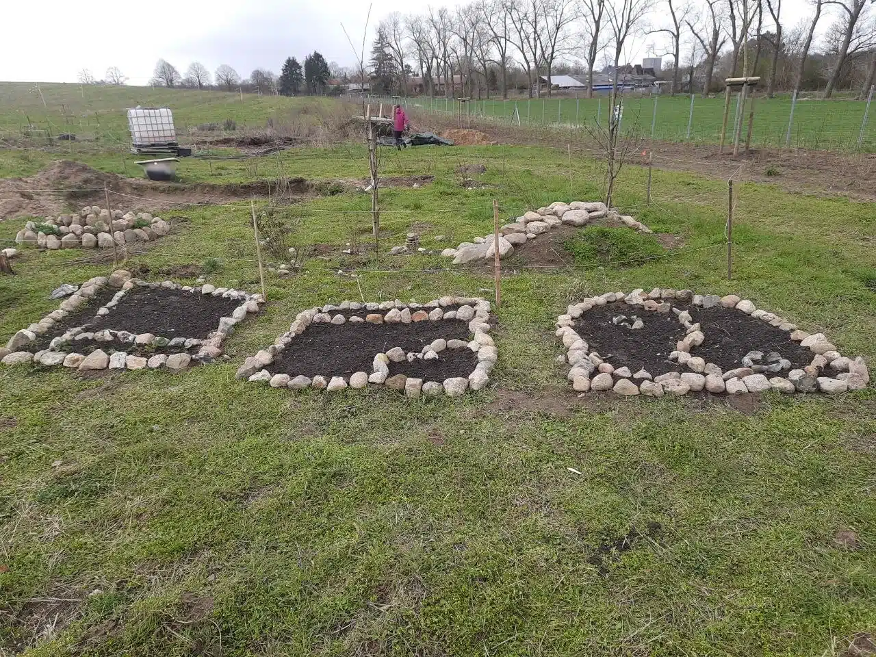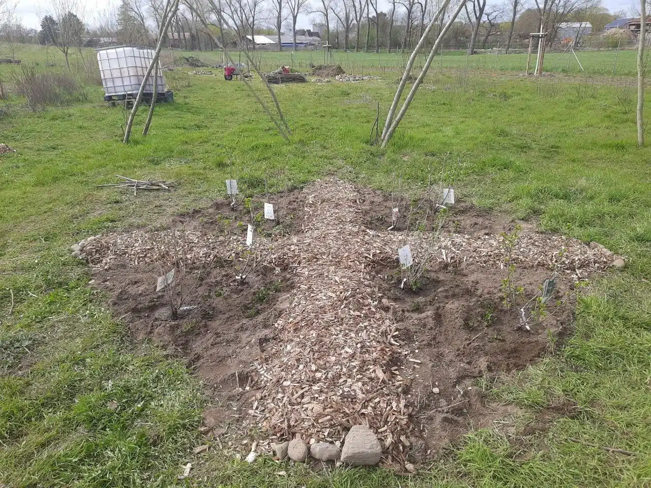 Ein weiteres Beerenbeet entsteht… (unten) hier gibt es drei Plätze zwischen den Beerenbeeten; zwei kleinere Pflückplätze und einen Sitzplatz in der Mitte. Hier wachsen verschiedene Sorten Himbeeren, Aroniabeeren, verschiedene Sorten Johannisbeeren und Erdbeeren.