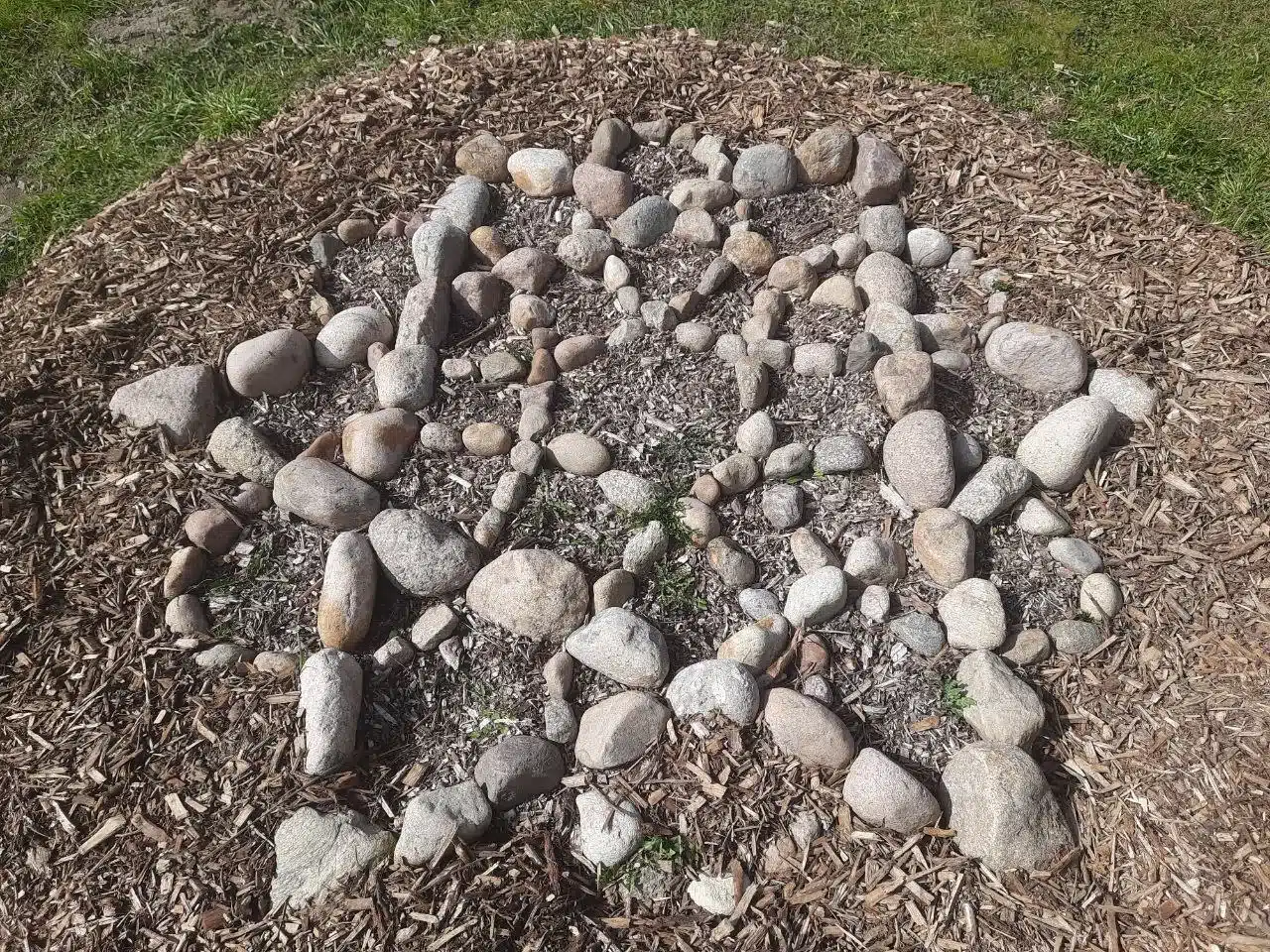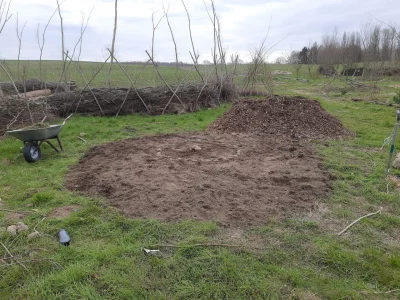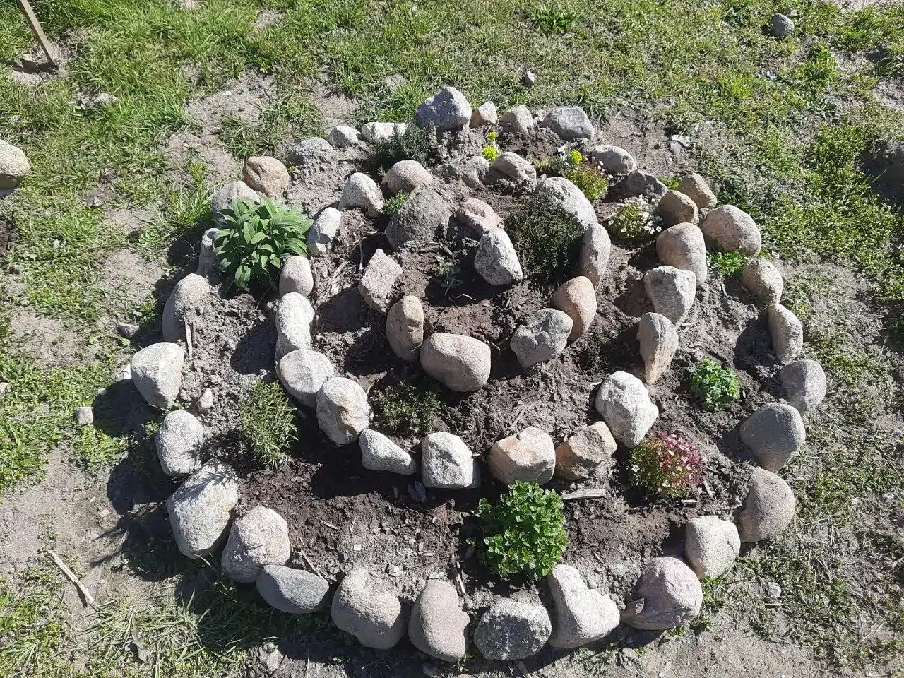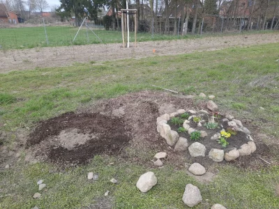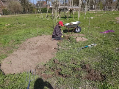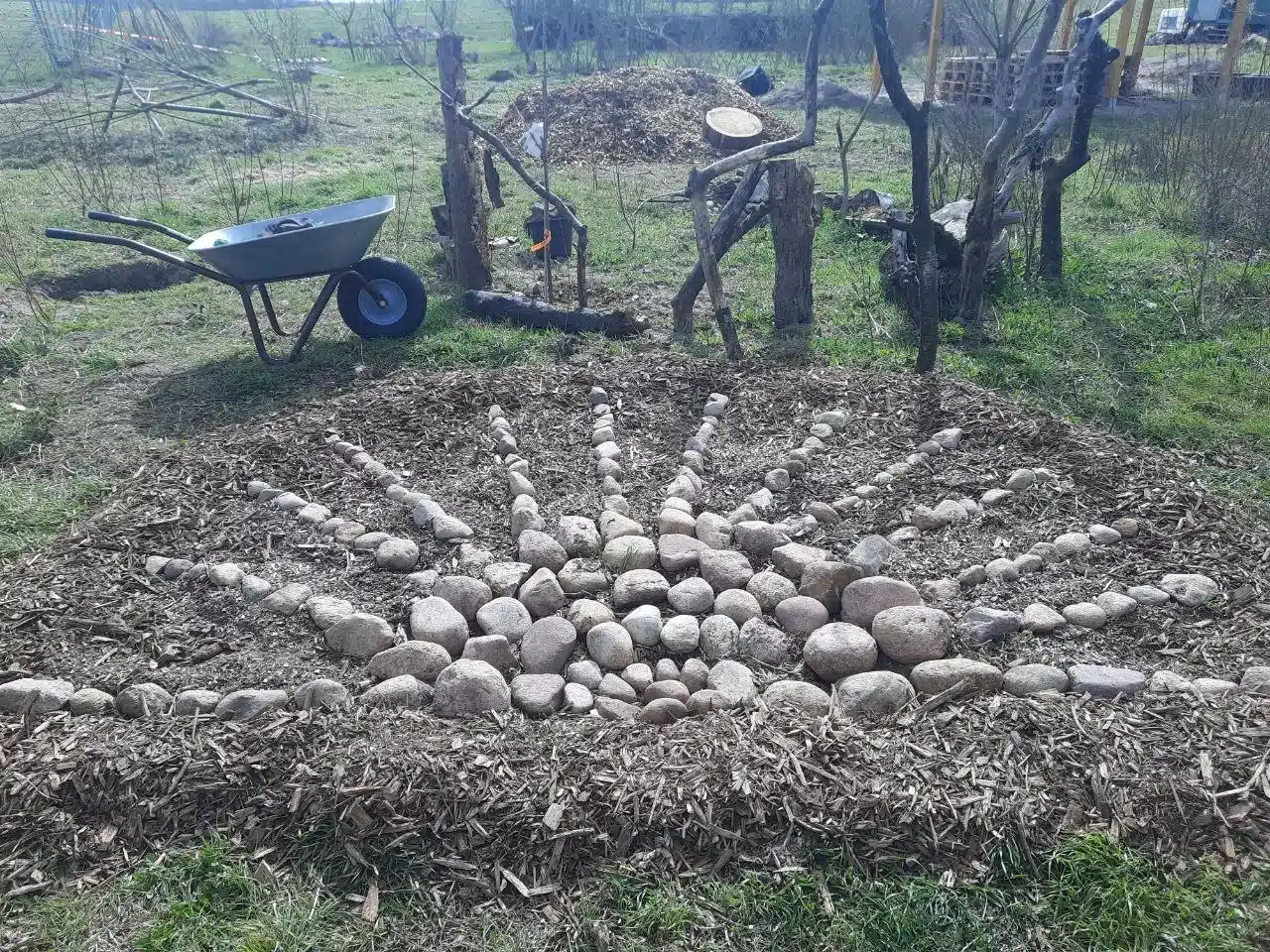 Wir legen ein Blumen – Stauden – Beerenbeet mit einem Platz zum Verweilen in der Mitte in Form einer Sonne an. Bis alle Grassoden ausgegraben sind, vergeht Zeit. Das Material, das wir hier “über” haben, verwenden wir an einer anderen Stelle wieder. Das passiert dauernd, dass Materialien an einer Stelle anfallen und dann genau woanders gebraucht werden.