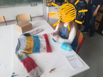 Marie und Anna möchten Socken stricken, also schauen wir uns passendes Material an und probieren verschiedene Techniken aus (Rundstricknadel und Nadelspiel). Sockenstricken ist eine sehr anspruchsvolle Aufgabe, das wird allen klar. Ida strickt einen neuen Schal. Übrigens: Marie hat tatsächlich ihren Pulli von vor den Ferien zu Ende gestrickt. Seht euch das Meisterwerk an!
