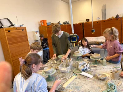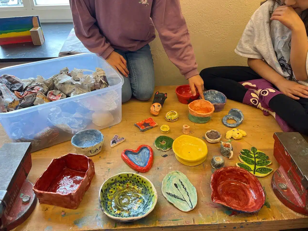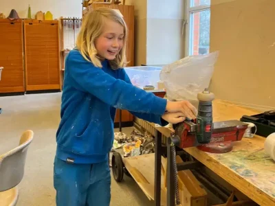 Emma war begeistert zu beobachten, wie ausdauernd und konzentriert Otto seine erste selbsterdachte elektrisch betriebene Drehscheiben gebaut hat. Der Antrieb ist ein Akkuschrauber, der per Gummiband die Bewegung an die Drehscheibe überträgt. Sehr beeindruckend, ohne jegliche Hilfe! Oder wie Charlotta mehrfach anderen Kindern geholfen- und sie positiv bestärkt hat. Oder wie Raik ein Kriegsschiff und ein Uboot im Meer getöpfert hat, ganz fein, präzise und durchdacht mit Wellengang, Torpedos und 3D Effekt. Die ersten Töpferwerke sind nun fertig gebrannt und die Kinder bewundern die Ergebnisse und Farben.