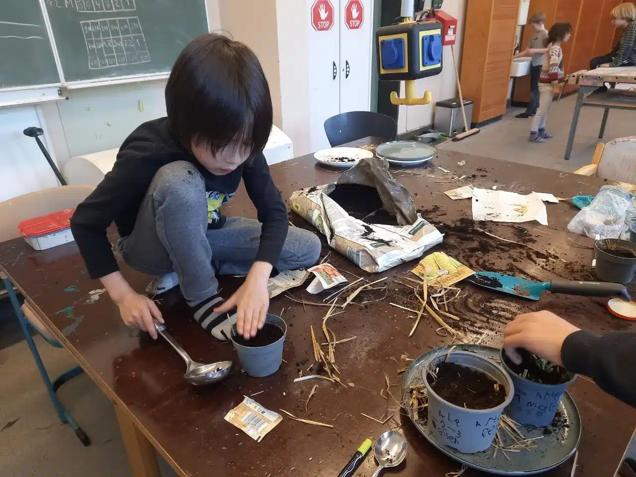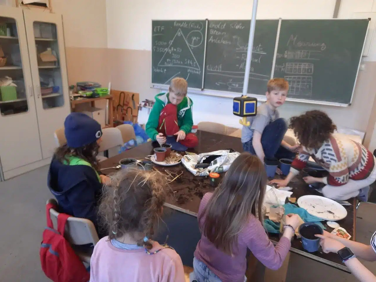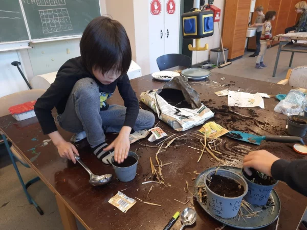 Wir sähen verschiedene Samen (Gemüse, Blumen, Bäume) und pflanzen kleine Pflanzen in Töpfe mit Erde. Die Kinder arbeiten sehr selbstständig, sind grundsätzlich interessiert und begeistern sich ímmer mehr im Laufe des Angebots. Es ergeben sich noch einige Fragen und die Kinder helfen sich untereinander. Die fertigen Töpfe gehen alle mit nach Hause.