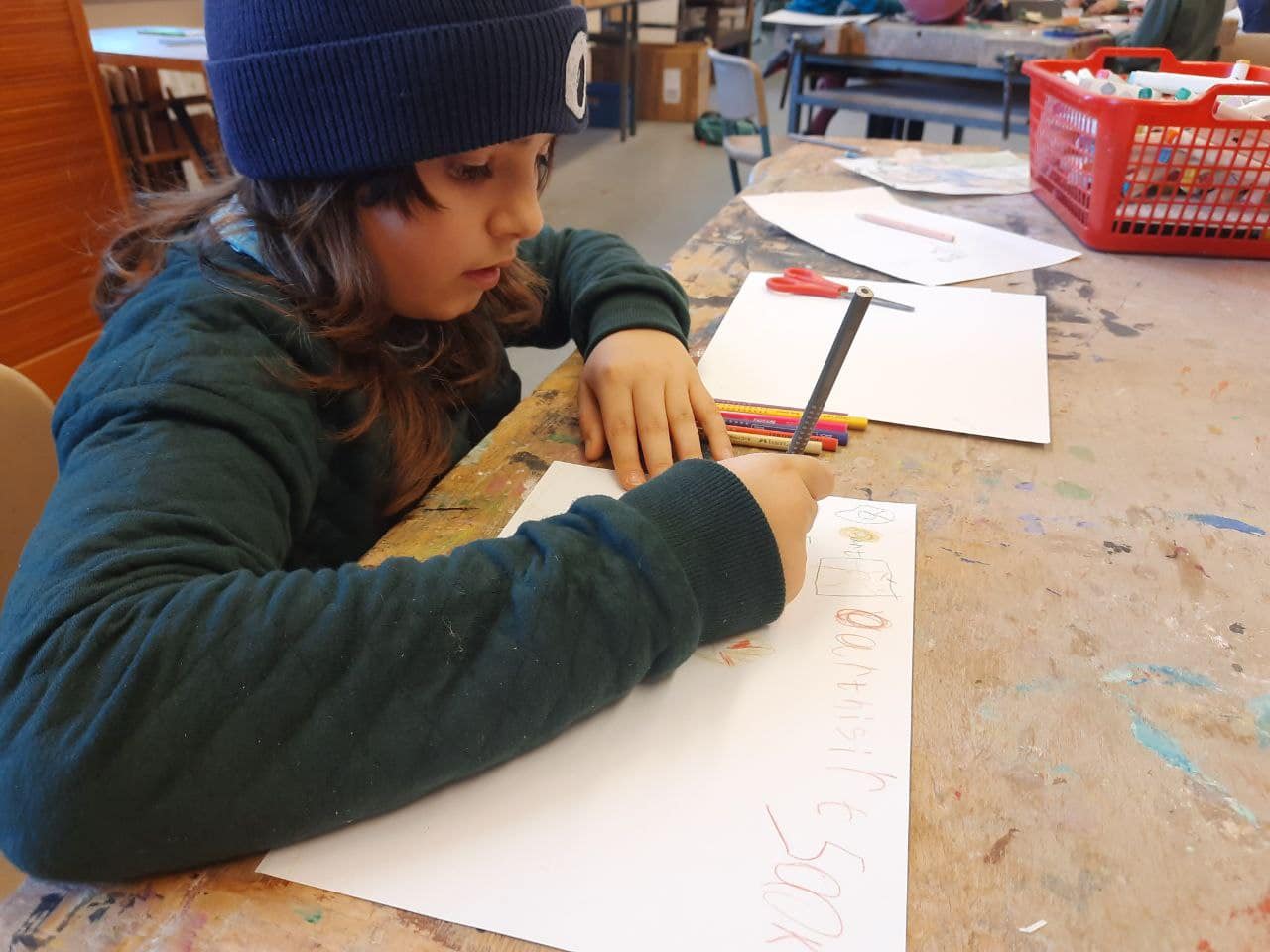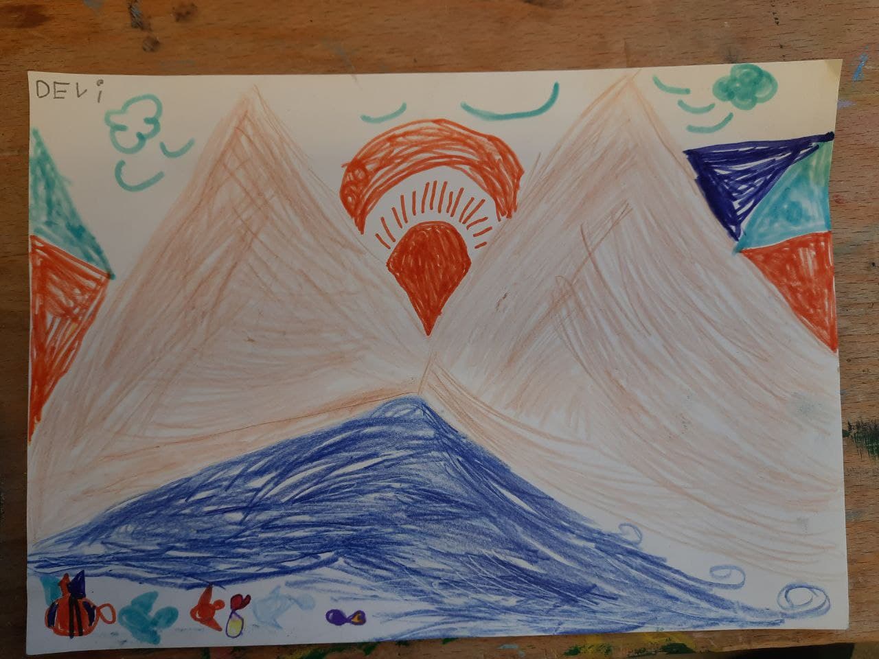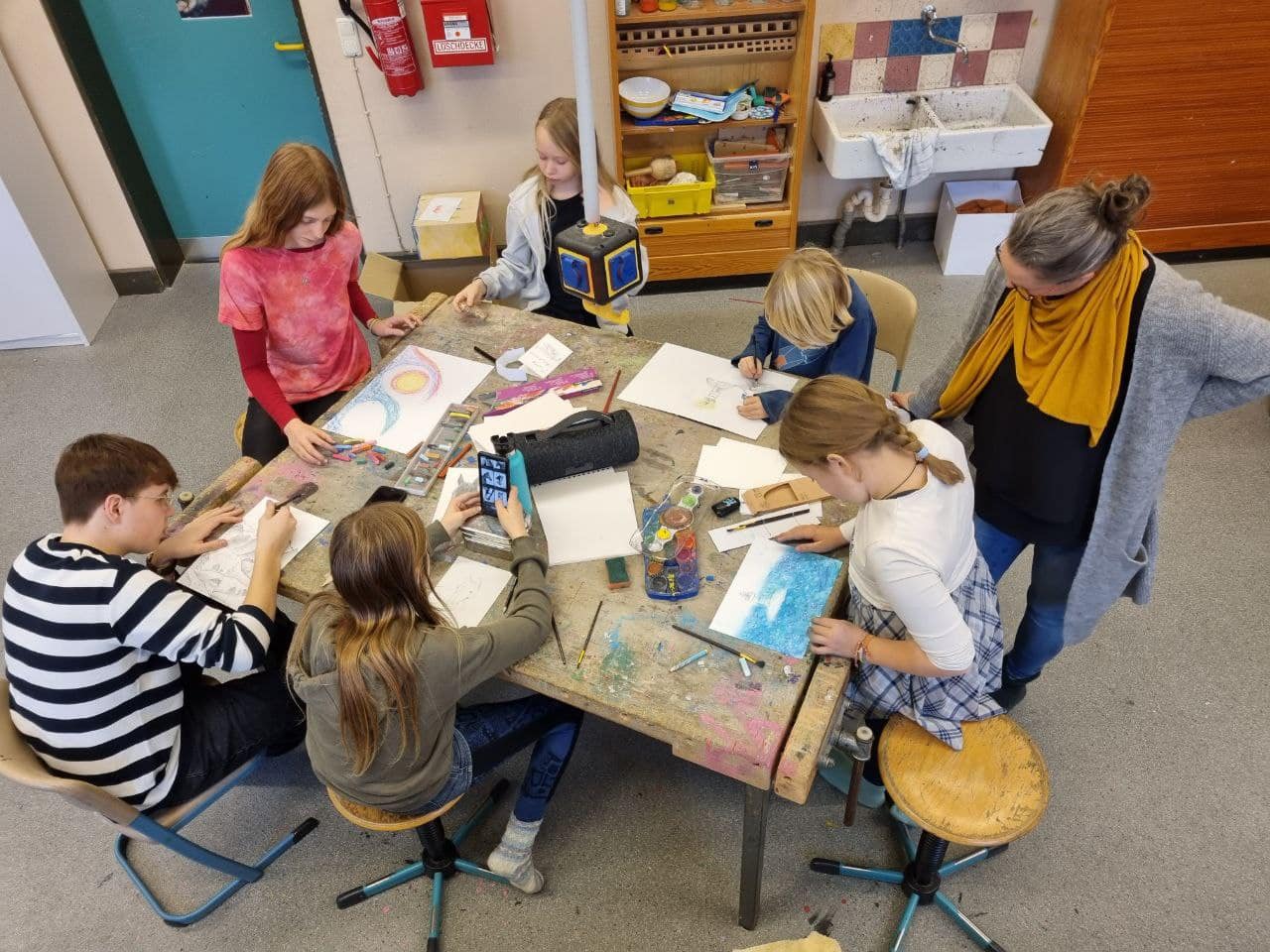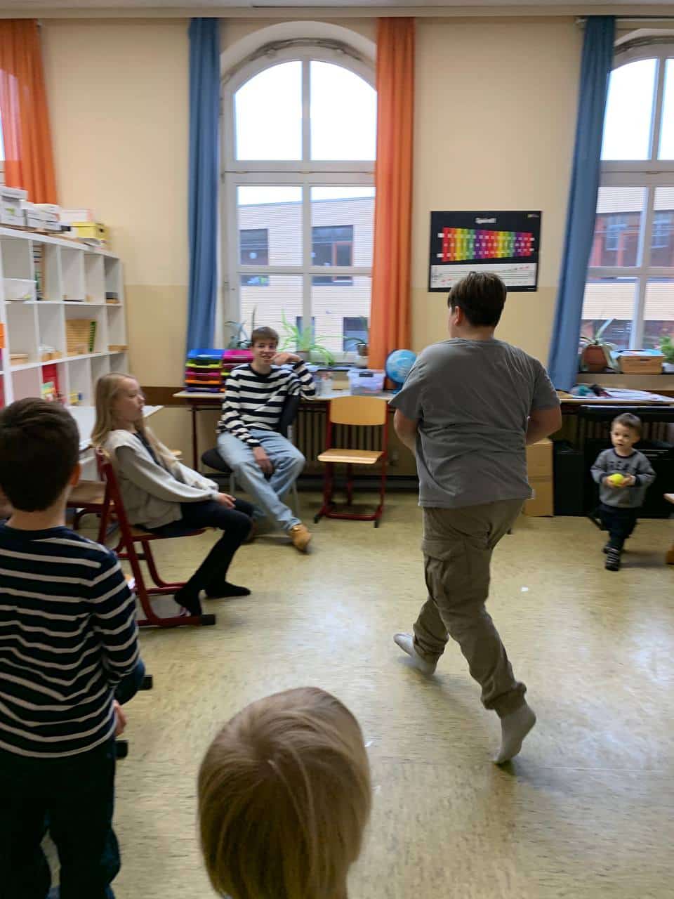 Joshua, Emma D., Lunis, Lisa und Mads zeichneten alle ihre Interpretation von “Wind und Wellen” mit Kreide. Vor allem Mads betonte, wie viel Freude ihm das Kreide malen macht und dass ihm das Preis Geld nicht mehr wichtig ist, obwohl er zuvor noch erzählt hatte, wie “pleite” er sei. Es ist so toll zu sehen, wie viel Freude die Kinder beim künstlerischen Gestalten empfinden und wie zufrieden sie mit ihren Ergebnisse sind. Und das obwohl fast jeder vorher behauptet hat: “Ich kann eigentlich nicht malen.“