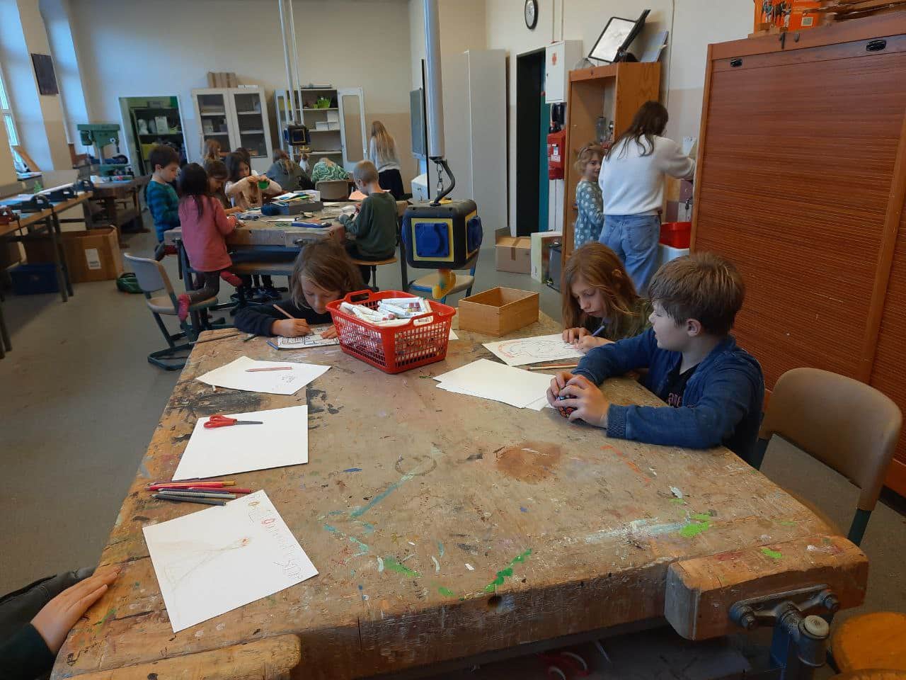 Manchmal kommt es anders…. 😜Eigentlich wollte Karina mit dem Schneidegerät Lernmaterial schneiden. Sie kam aber nicht dazu, da die Kinder ihr zuvor kamen, das Gerät erkundeten und besetzten, und dabei so in einen Flow kamen, dass sie ewig damit geschnitten haben. Sämtliches Schmierpapier im Weltraum fiel dem Gerät zum Opfer. Was passiert eigentlich, wenn man das Papier vorher, drei Mal faltet und dann eine Ecke abschneidet? Oder sogar vier Mal faltet? Irgendwann ist es auf jeden Fall zu dick und lässt sich nicht mehr schneiden. Vorher aber entstehen interessante Muster. Am Ende gab es einen riesigen Schnipselhaufen, den wir gemeinsam aufgeräumt haben.