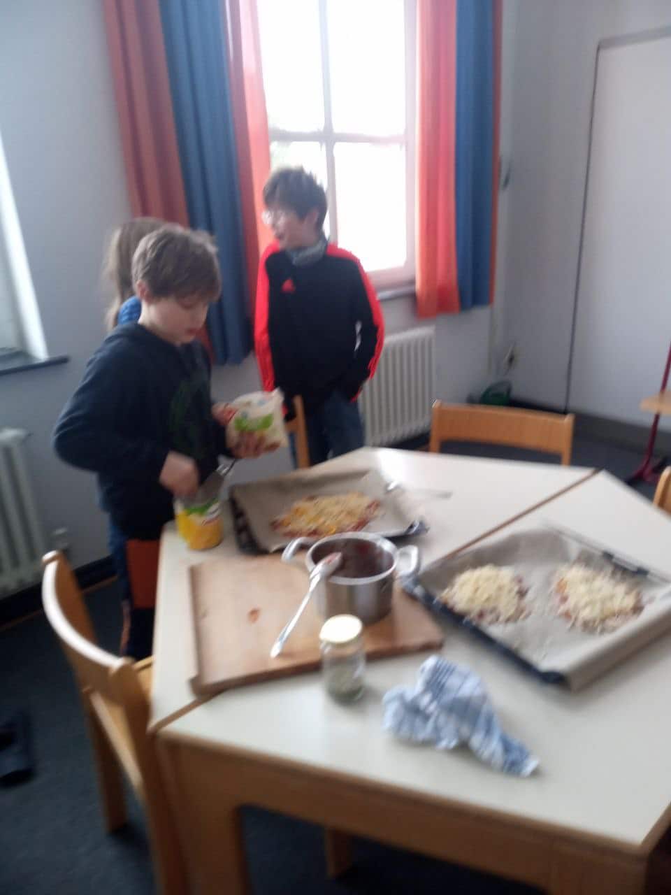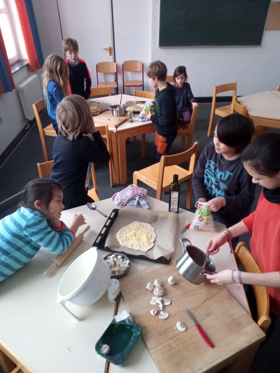 Unser Kochkurs hatte ein klares Ziel vor Augen: wir machen Pizza! Hier seht ihr die kleinen Köche bei der Arbeit:
