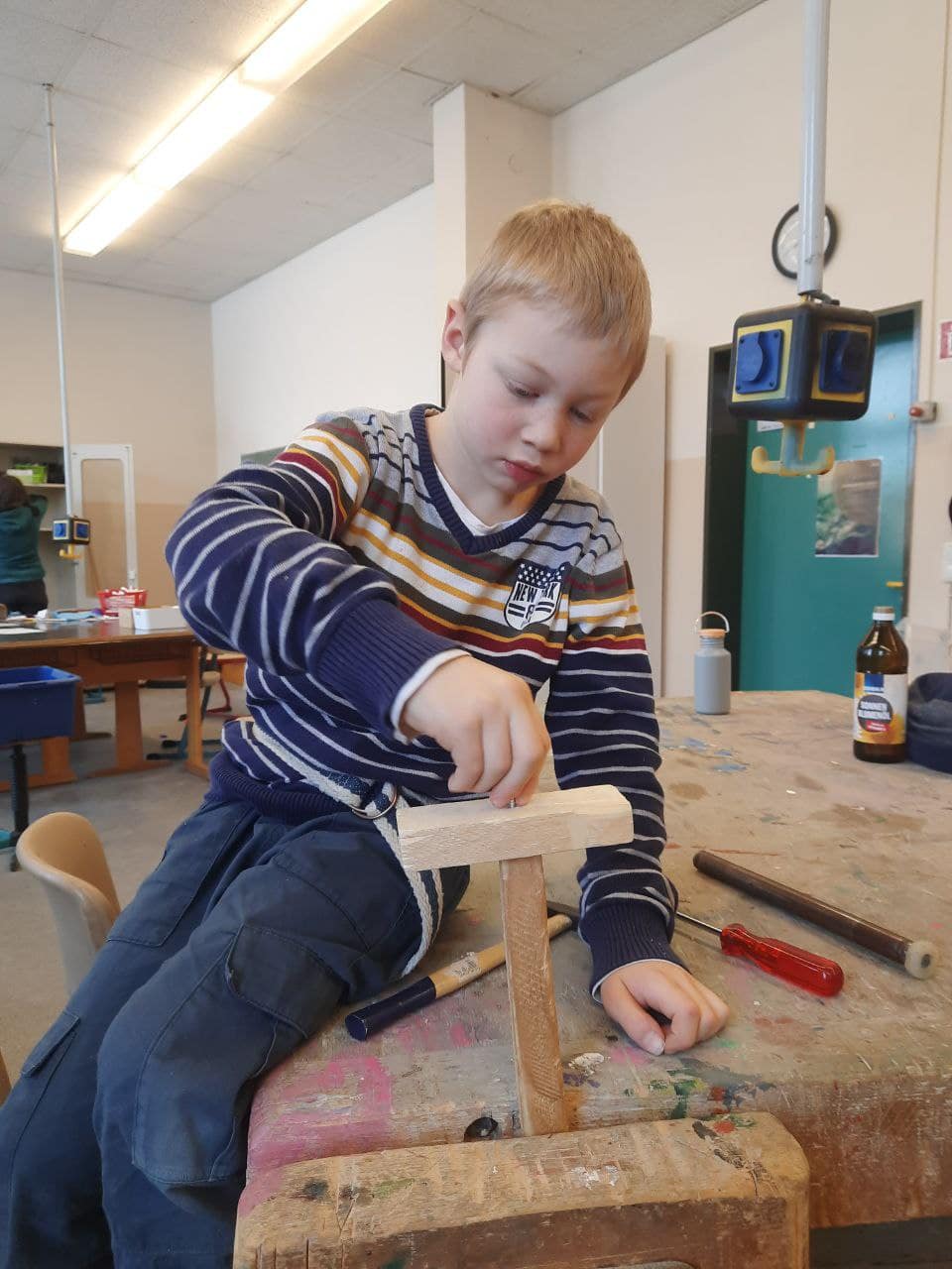 „Nils! Niiihiiiils! Komm jetzt, wir wollen werken!“ Die Kinder waren kaum zu halten, sie wollten endlich zusammen mit Nils an ihren Projekten weiterarbeiten: neue Murmelbahnelemente für Gravitrax, Holz Figuren, eine Rankhilfe für Pflanzen, einen Hammer, einen Garderobenhaken usw. Welches Werkzeug brauche ich? Was kann ich tun, damit etwas hält? Wir können immer wieder beobachten, wie die Kinder sich gegenseitig beraten und helfen.