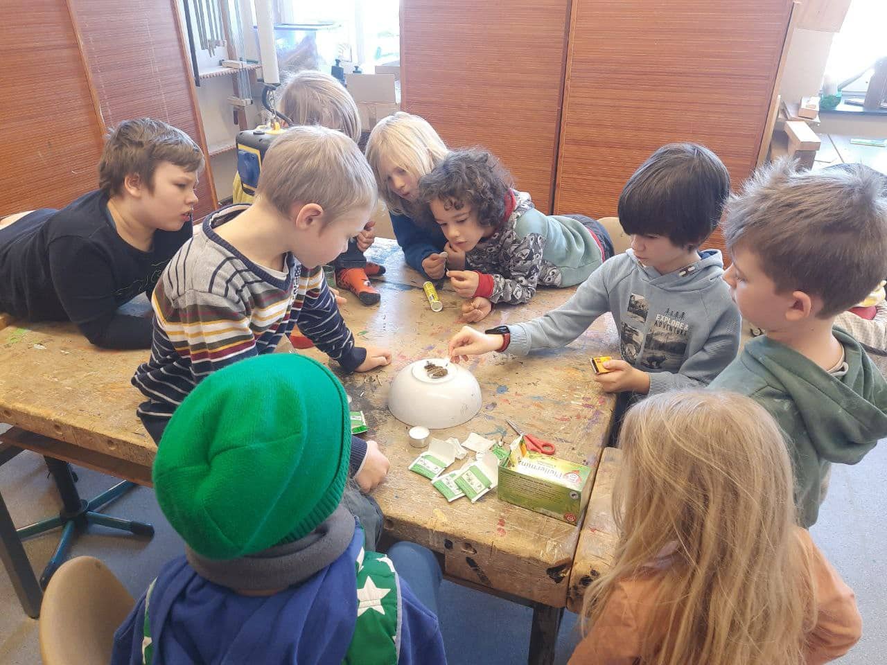 Hier seht ihr unsere Experimentier- und Forschergruppe, die sich mit spannenden Fragen beschäftigt. Warum geht das Wasser im Glas einfach hoch? Warum bewegt sich der Papierfisch im Wasser vorwärts?