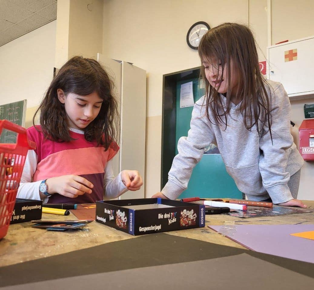 Diese Mädchen verpassen dem Spiel „ die drei Fragezeichen“ ein Upgrade. Ihnen gefielen die Bilder der Menschen dort überhaupt nicht. Zunächst haben sie neue, schönere Charaktere entworfen und dazu auch gleich ein neues Spielbrett. Das Original war viel zu klein.