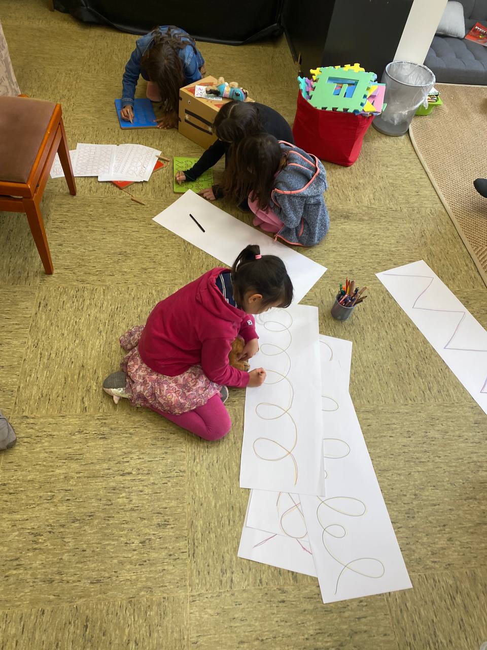 Im ruhigeren Weltraum halten sich zurzeit ziemlich viele Kinder auf und lernen dort auf ihre Art. Die Lernbegleiter dort wechseln immer mal wieder das Material, welches im vorderen Raum auslegt. Nach den Comics und der Spiegelstation ist es nun Material zum Thema Steinzeit. Auf dem mittleren Bild seht ihr Schwungübungen, um ins flüssige Schreiben zu kommen. Das ist gar nicht so einfach, wie es aussieht – in dieser Größe erst recht nicht.