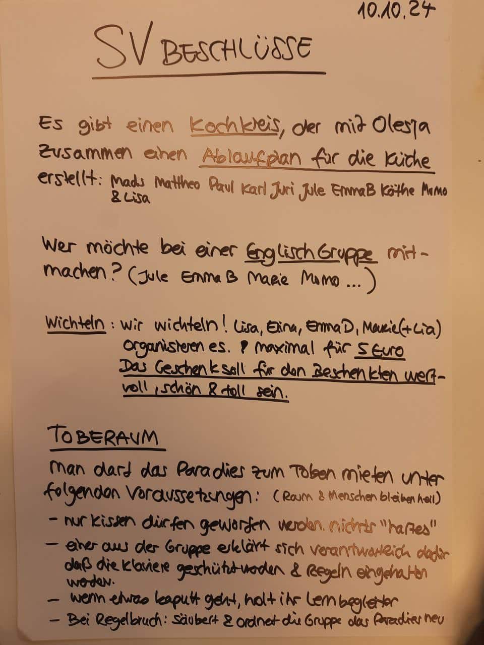 Wir bemühen uns auch gemeinsam in der SV darum, die Verantwortung für die verschiedenen Bereiche (zb Küche, Räume aufräumen) nun besser zu verteilen und die Kinder mehr in die Verantwortung zu nehmen. Freiheit und Verantwortung gehören für uns zusammen. Einige Kinder denken wirklich, dass freie Schule bedeutet: „Ich kann hier jederzeit machen was ich will. Gemeinschaft interessiert mich nur dann, wenn ich davon etwas bekomme.“ Dieses, oder andere unbewusste Mangelkonzepte, – übernommen oder selbst erschaffen – brauchen unsere Aufmerksamkeit im Alltag. Wir arbeiten daran, dass die Betreffenden mehr und mehr erkennen, wer sie wirklich sind (ohne ihre Mangelkonzepte) und welche Kraft in ihnen lebt. (Dieser Satz gilt übrigens auch für die Lernbegleiter.)