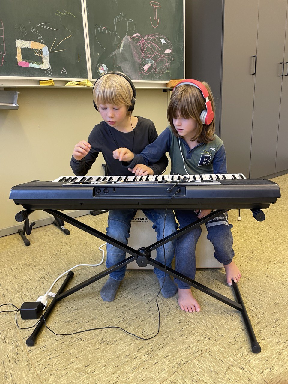 Diese Kinder beschäftigen sich mit großer Hingabe mit den Sounds des Keyboards und erforschen der Klang des Keyboards.