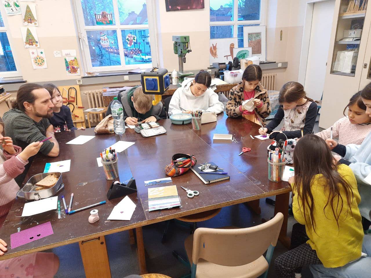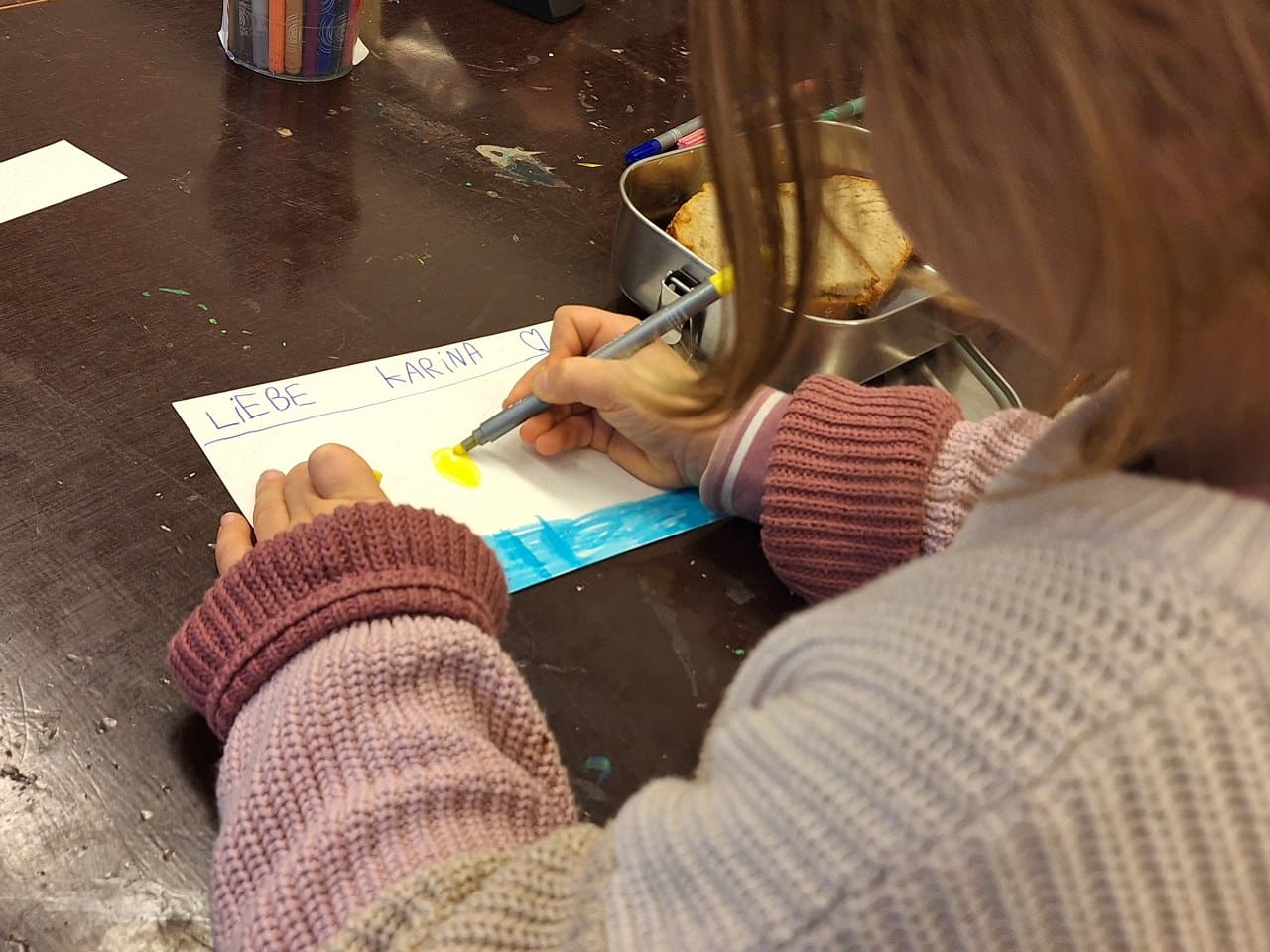 “Ich weiss gar nicht, was ich sagen soll. Ich mag mir gar nicht vorstellen, wie das für sie sein muss. Es tut mir so leid für Karina.” Wir haben uns in einem Kreis in der der Werkstatt getroffen, ein paar wenige Worte gewechselt, denn viel konnten wir einfach nicht sagen. Es war ein kleiner Schock. Also waren wir einfach in dieser Stimmung zusammen in der Werkstatt und die Kinder haben mit viel Liebe für Karina Karten gebastelt und Briefe geschrieben, in denen sie ihr Mitgefühl ausgedrückt haben. Liebe Karina, wir denken an dich!