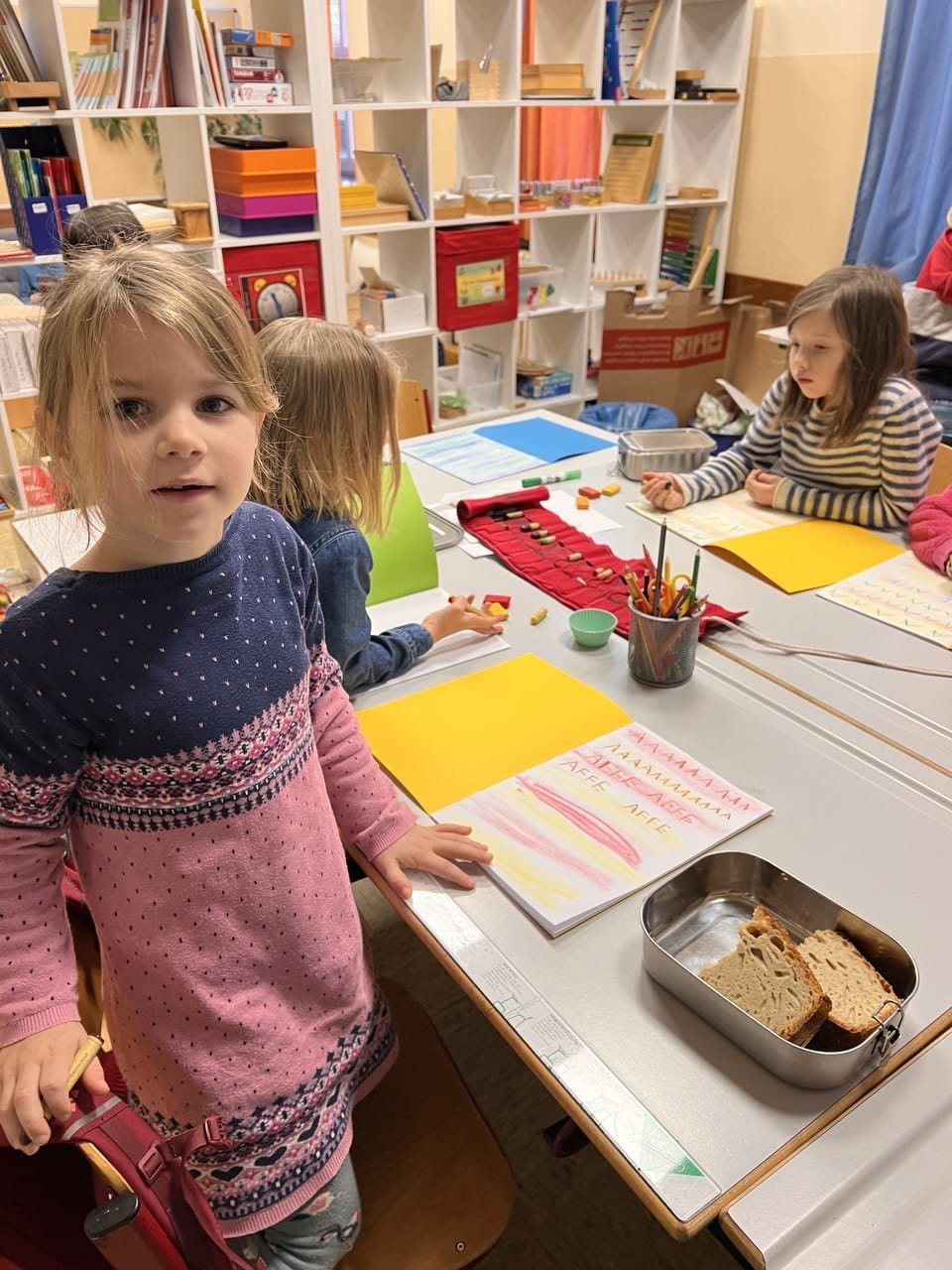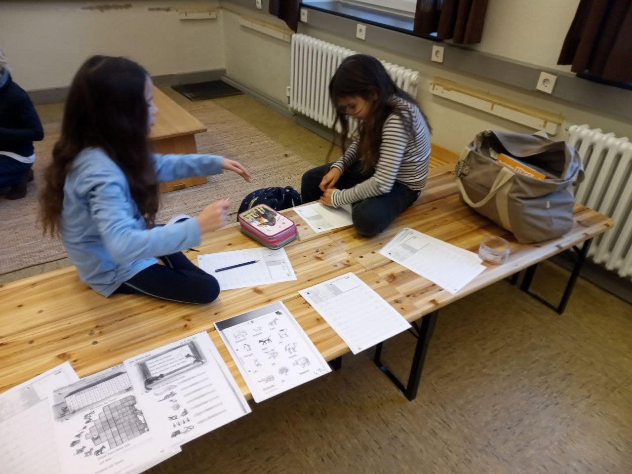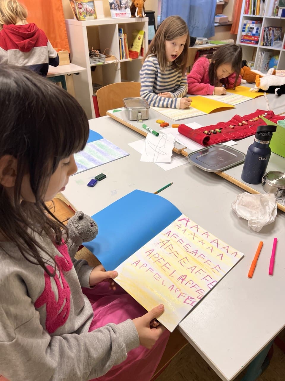 In der Gruppenzeit haben die Kinder z.B. Buchstaben geschrieben, Reimwörter kennengelernt, sich selber Geschichten zu Bildern ausgedacht und aufgeschrieben, Buchstaben aus Worten herausgehört, im Kreis eine Geschichten erfunden, für einige gab es Schwungübungen und Schreibschriftübungen, andere haben Stille Post extrem kennengelernt (mit schreiben und malen), wieder eine andere Gruppe hat sich damit beschäftigt, eine Ballade zu verstehen und zusammenzufassen. Dazu bekamen einige Teamaufgaben, die sie nur gemeinsam bewältigen konnten.