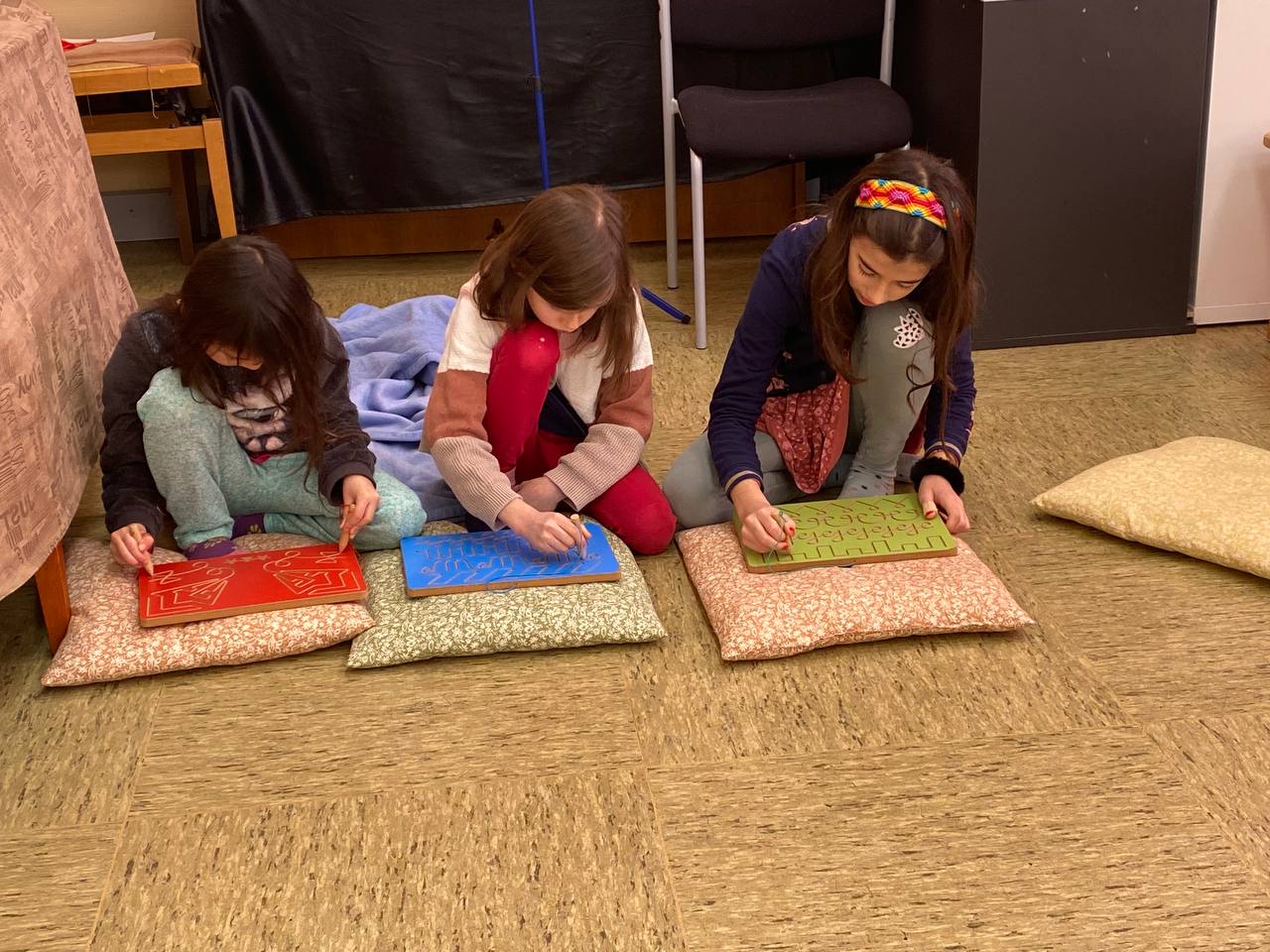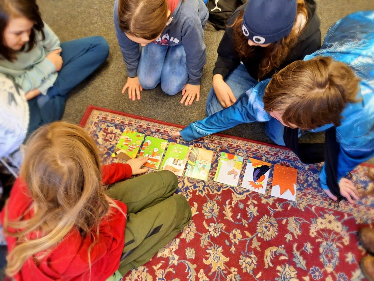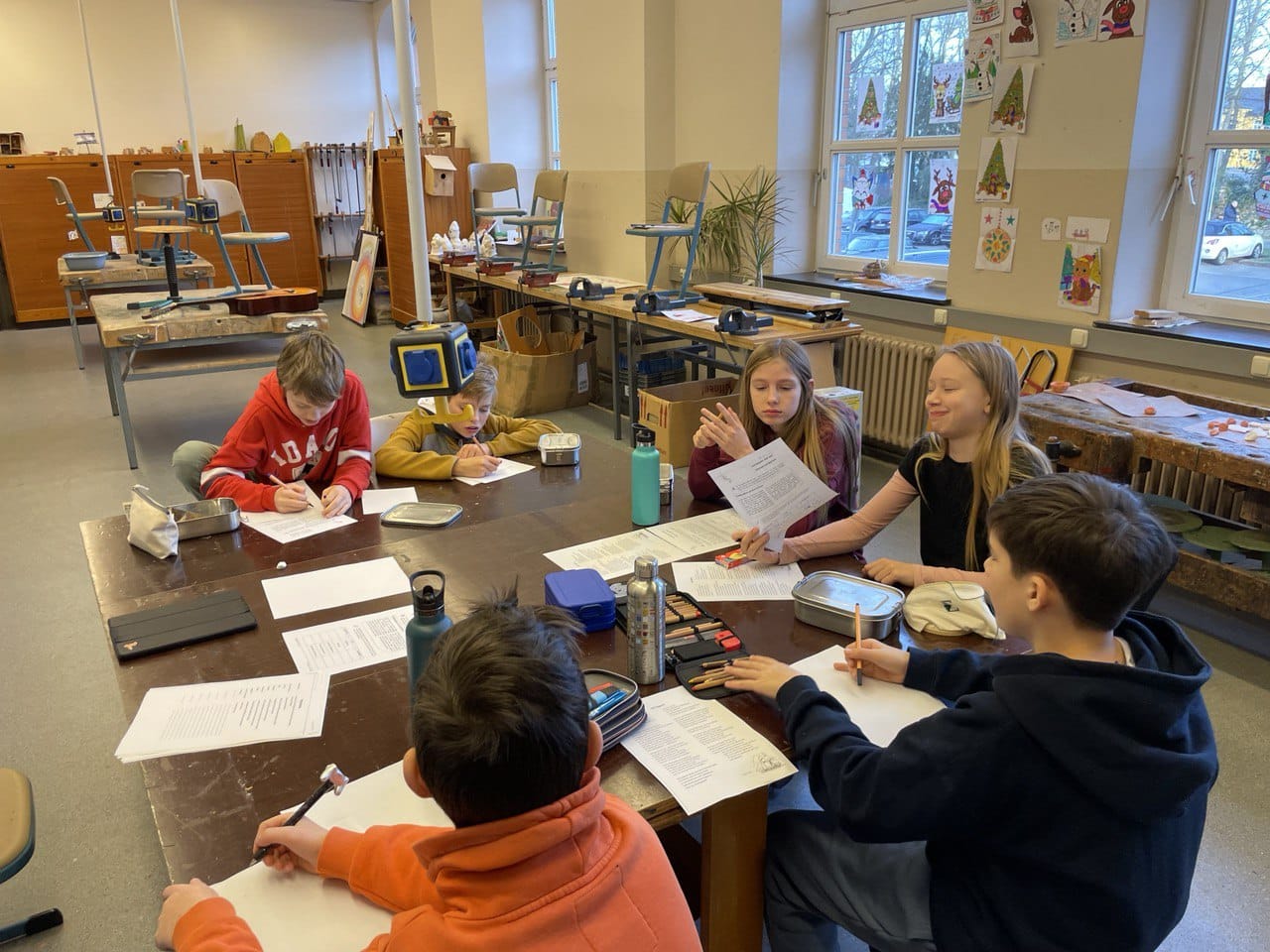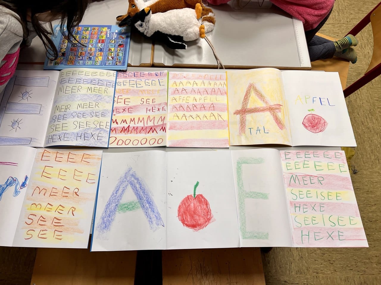 In der Gruppenzeit haben die Kinder z.B. Buchstaben geschrieben, Reimwörter kennengelernt, sich selber Geschichten zu Bildern ausgedacht und aufgeschrieben, Buchstaben aus Worten herausgehört, im Kreis eine Geschichten erfunden, für einige gab es Schwungübungen und Schreibschriftübungen, andere haben Stille Post extrem kennengelernt (mit schreiben und malen), wieder eine andere Gruppe hat sich damit beschäftigt, eine Ballade zu verstehen und zusammenzufassen. Dazu bekamen einige Teamaufgaben, die sie nur gemeinsam bewältigen konnten.