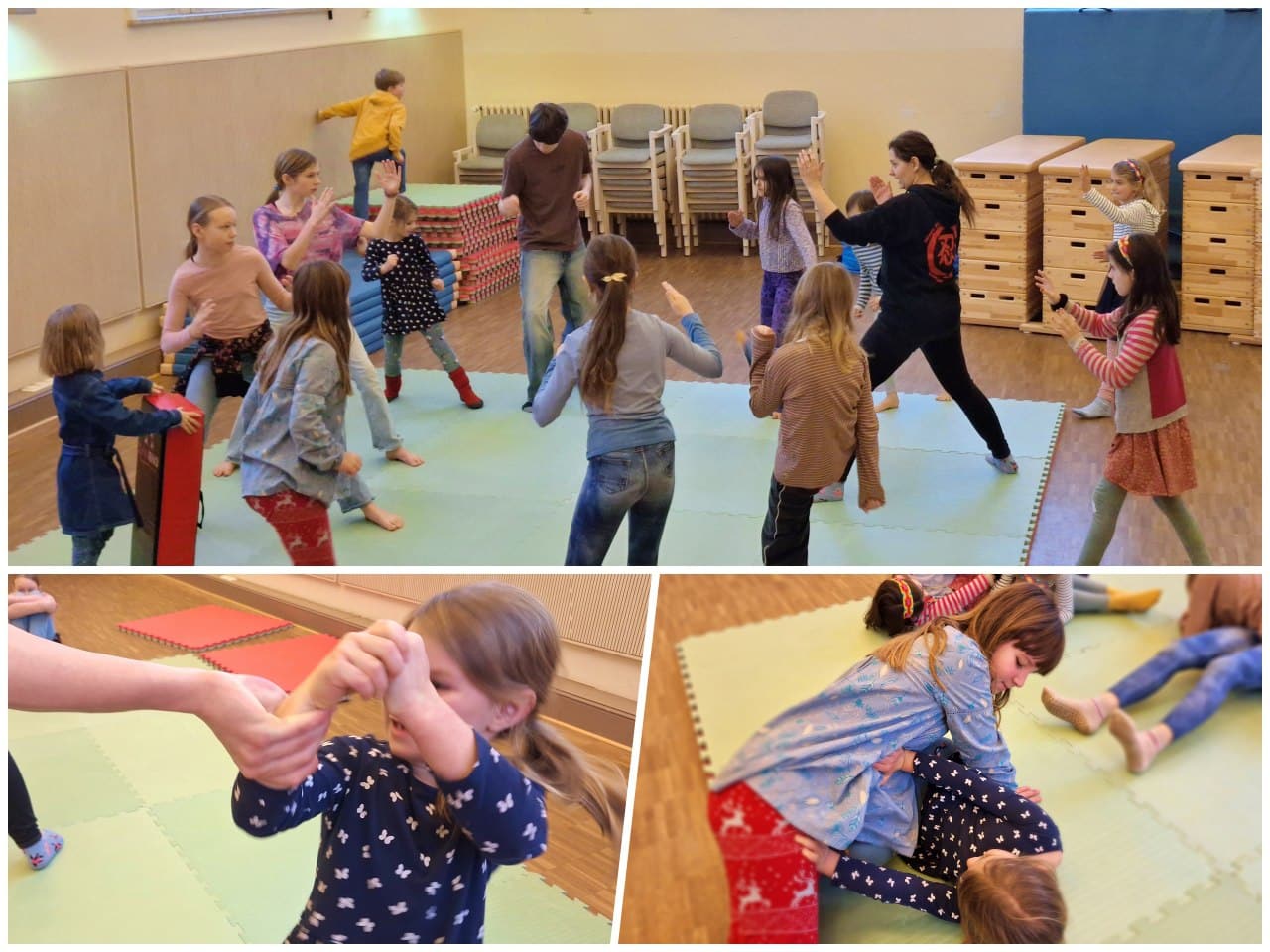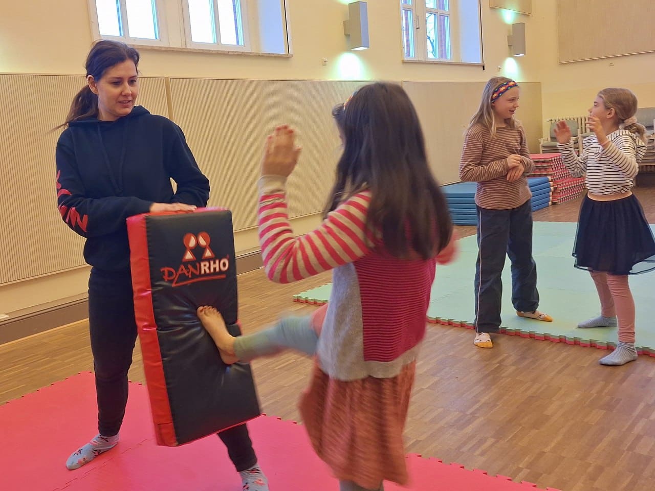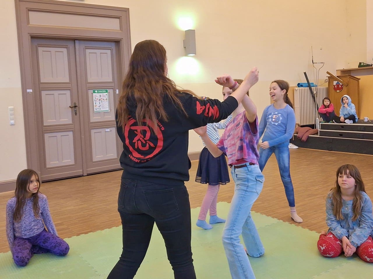 Jana ist jetzt wieder einmal in der Woche bei uns und übt mit zwei Gruppen Selbstbehauptung, Selbstverteidgung und Körperwahrnehmung. “Wir lernen effektive Methoden, einen gewaltvollen Konflikt zu vermeiden, indem wir üben selbstbewusst aufzutreten. “