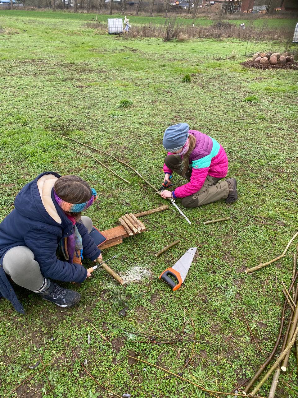 haben wir angefangen, ein Vogelhaus kostengünstig (und sehr hübsch) selbst herzustellen. Dafür haben wir Äste auf Maß zugeschnitten und Löcher vorgebohrt. Nächstes Mal geht es weiter.