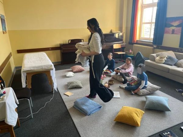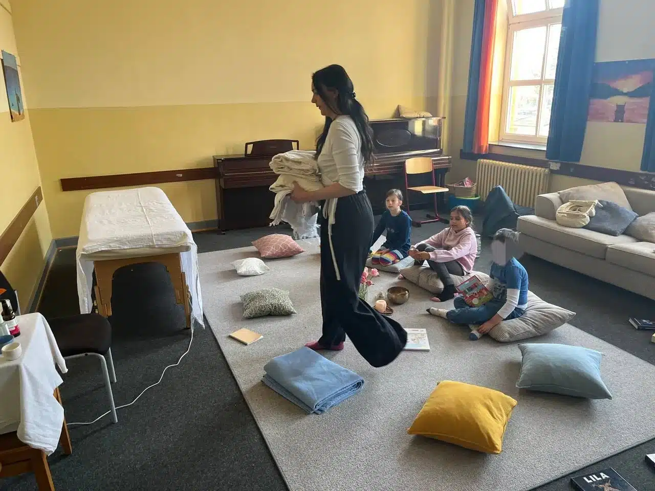 Kathie hatte ihre Massageliege und einen kleinen Tisch mit Pflegeprodukten aufgebaut, schöne Blumen-, eine Klangschale und viele spannende Bücher mitgebracht und den ganzen Raum so eingerichtet, dass man sich hier gleich wohl gefühlt hat. Denn eine sichere und wohlige Atmosphäre spielt bei ihrem Beruf eine wichtige Rolle, das konnten die teilnehmenden Kinder dadurch erleben. „Man hat sich gleich so willkommen gefühlt in dem Raum.“
